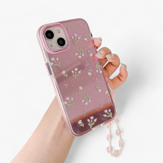 Luxuriöses Rosa | Spiegelblumen-iPhone-Hülle - Hübsche Perlenkette