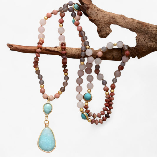 Tief reinigende Pastell Mala Perlenkette aus Amazonit und Rosenquarz