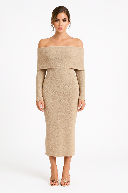 Bridget | Schulterfreies Bouclé-Strick-Midikleid in Taupe