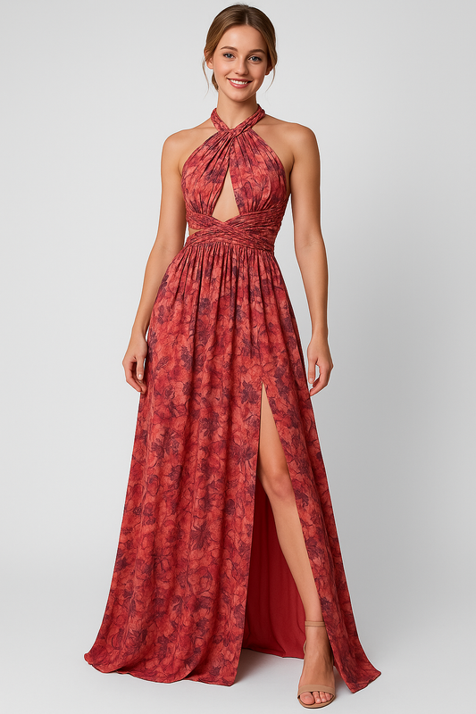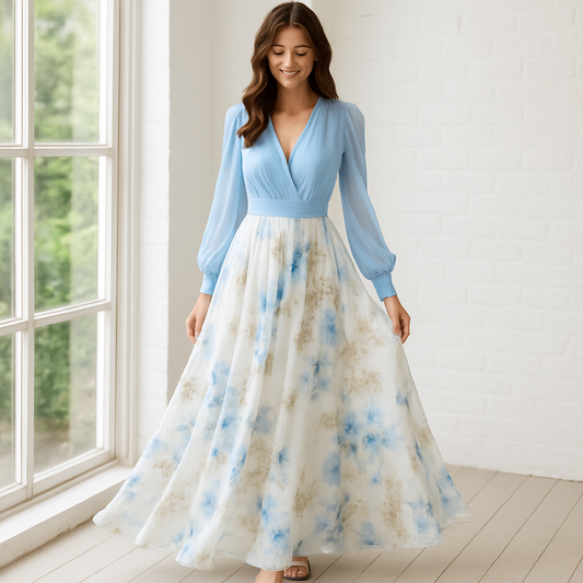 Cloe | Elegantes langes Kleid mit leichten Ärmeln und floralem Rock