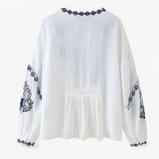 Alma | Boho-Bluse mit marineblauem Stickereimuster, lockere Passform