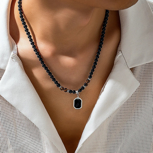 Jaze | Wilde Kragenstil – Halskette mit schwarzen Perlen und quadratischem Anhänger für Männer