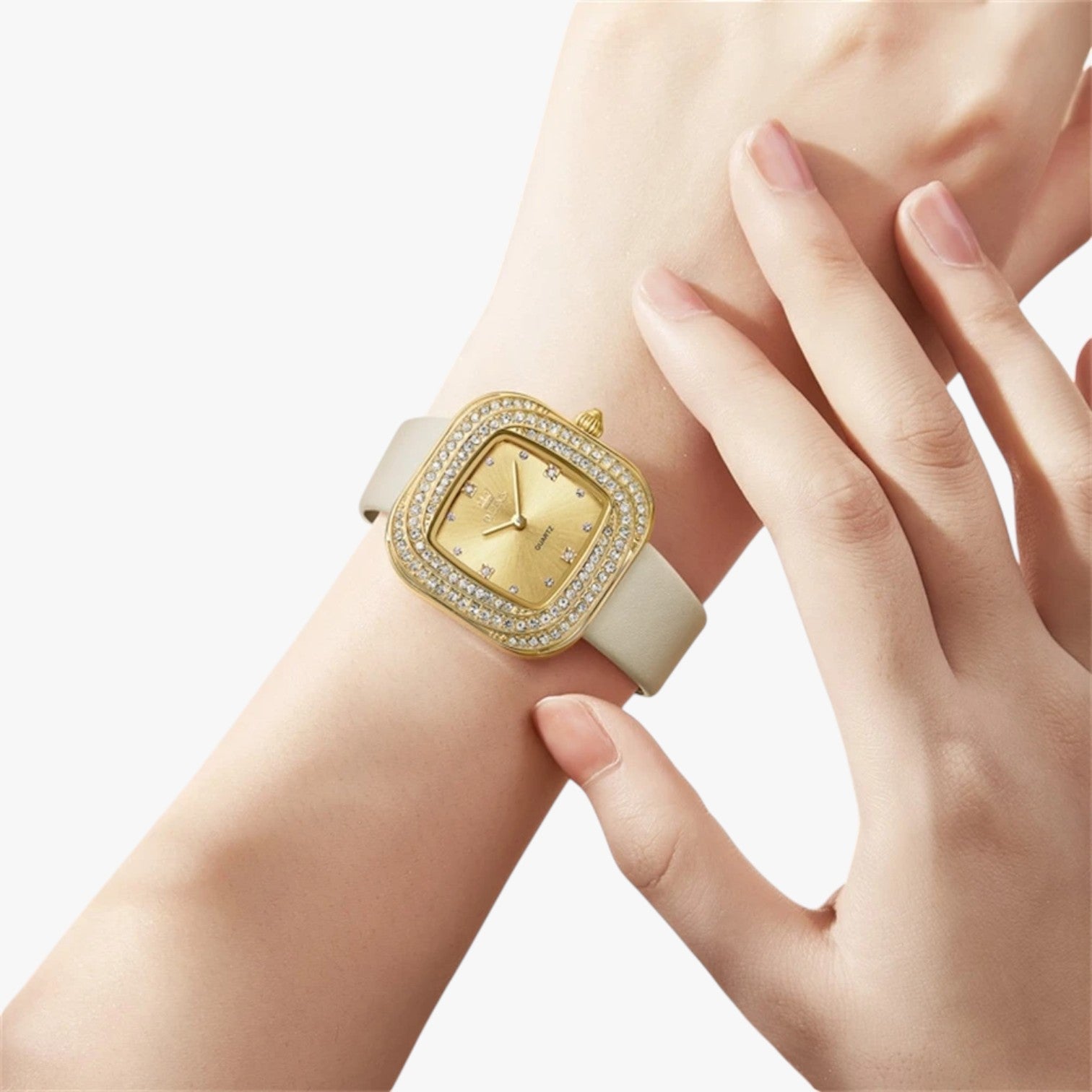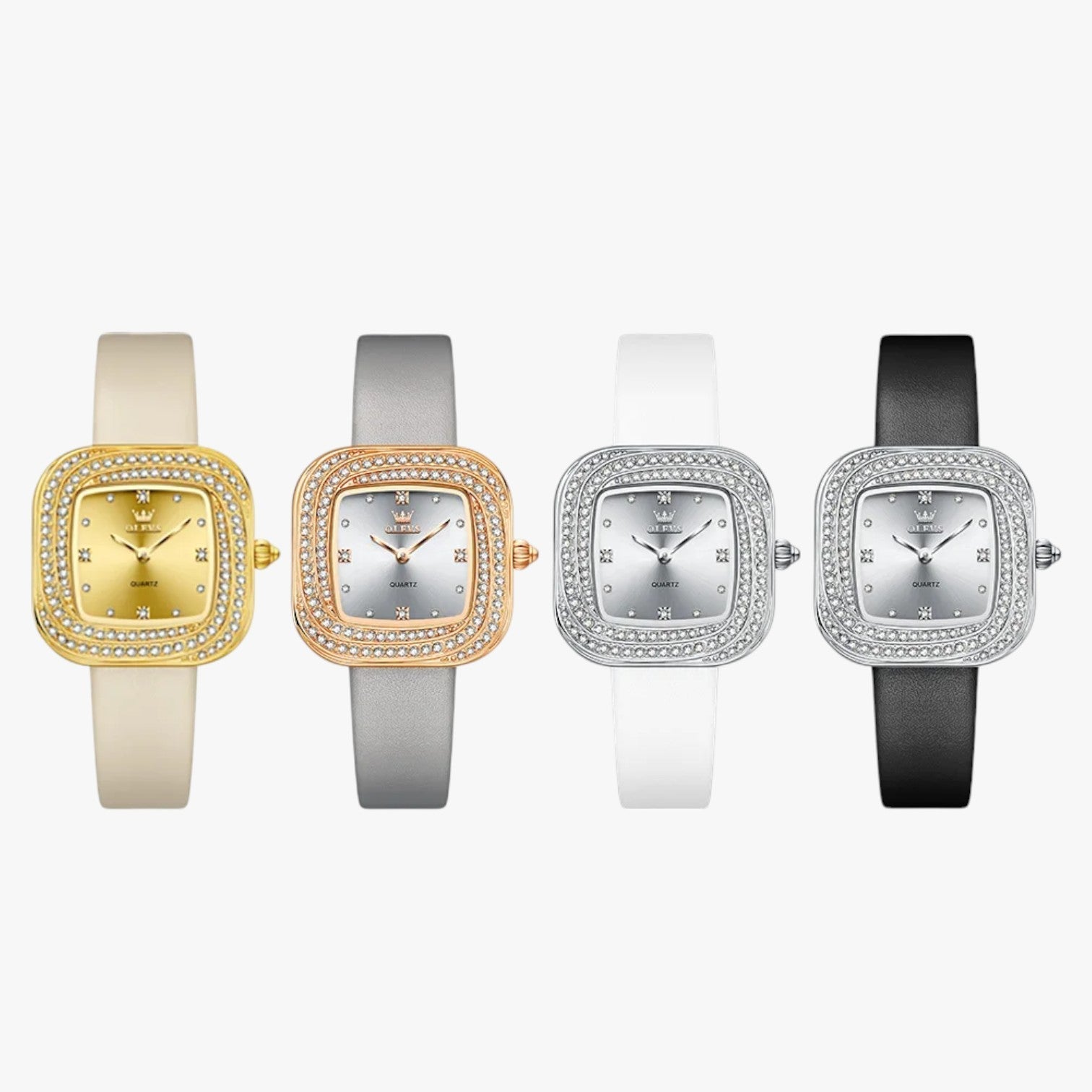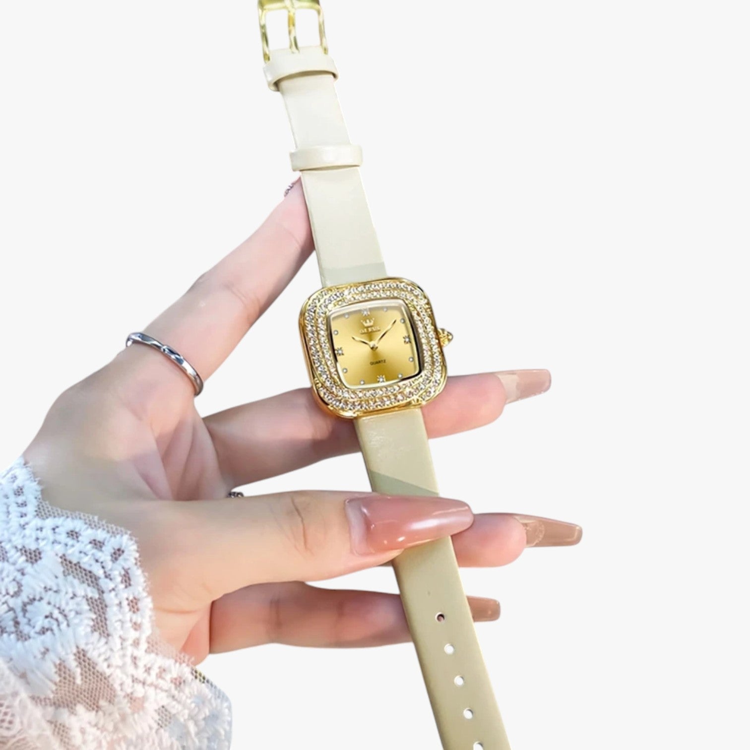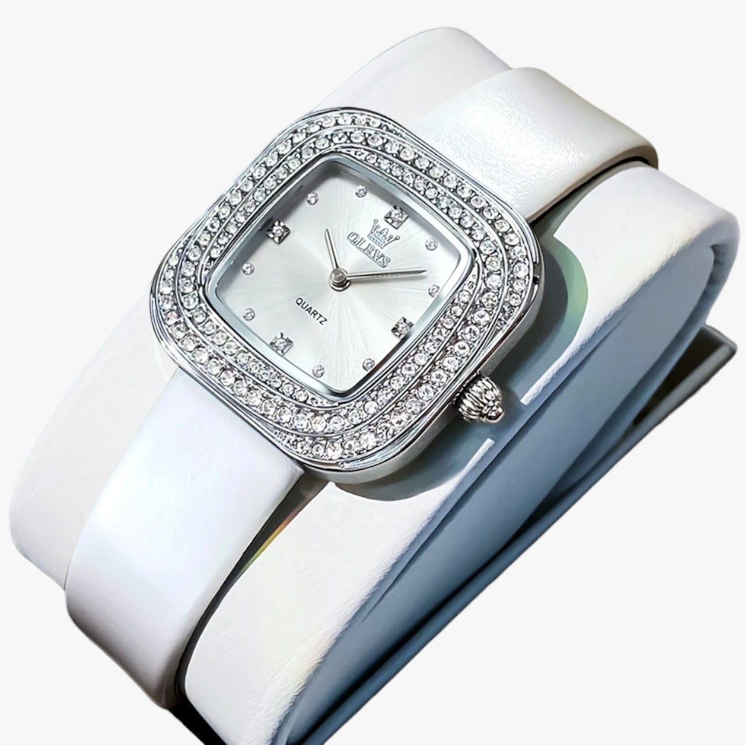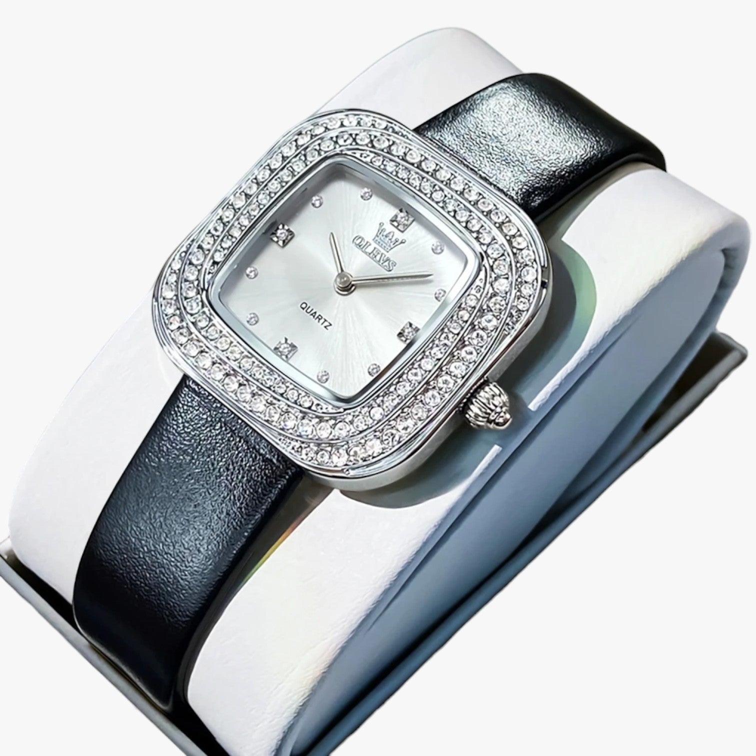 Das quadratische Design und das Lederarmband lassen sich problemlos zu jedem Outfit kombinieren – ob casual oder elegant.