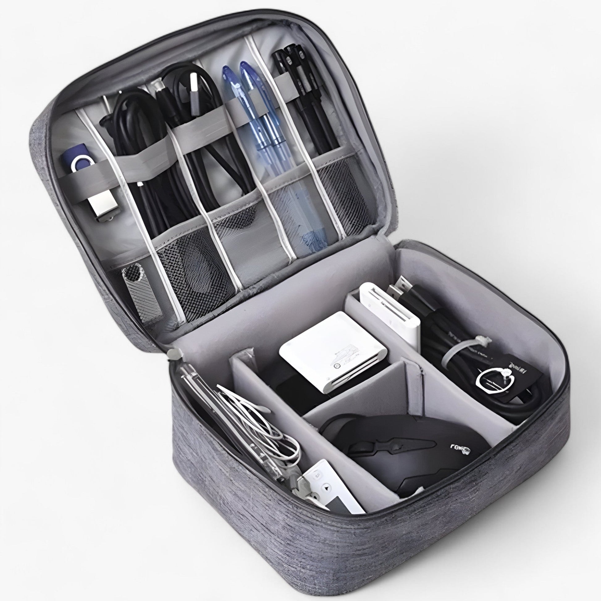 Diese Tasche wurde entwickelt, um Ihre USB-Kabel, tragbaren Ladegeräte, Powerbanks und sogar Ihr Nintendo Switch Zubehör aufzunehmen. Jeder Abschnitt ist so gestaltet, dass alles ordentlich und schnell griffbereit bleibt.