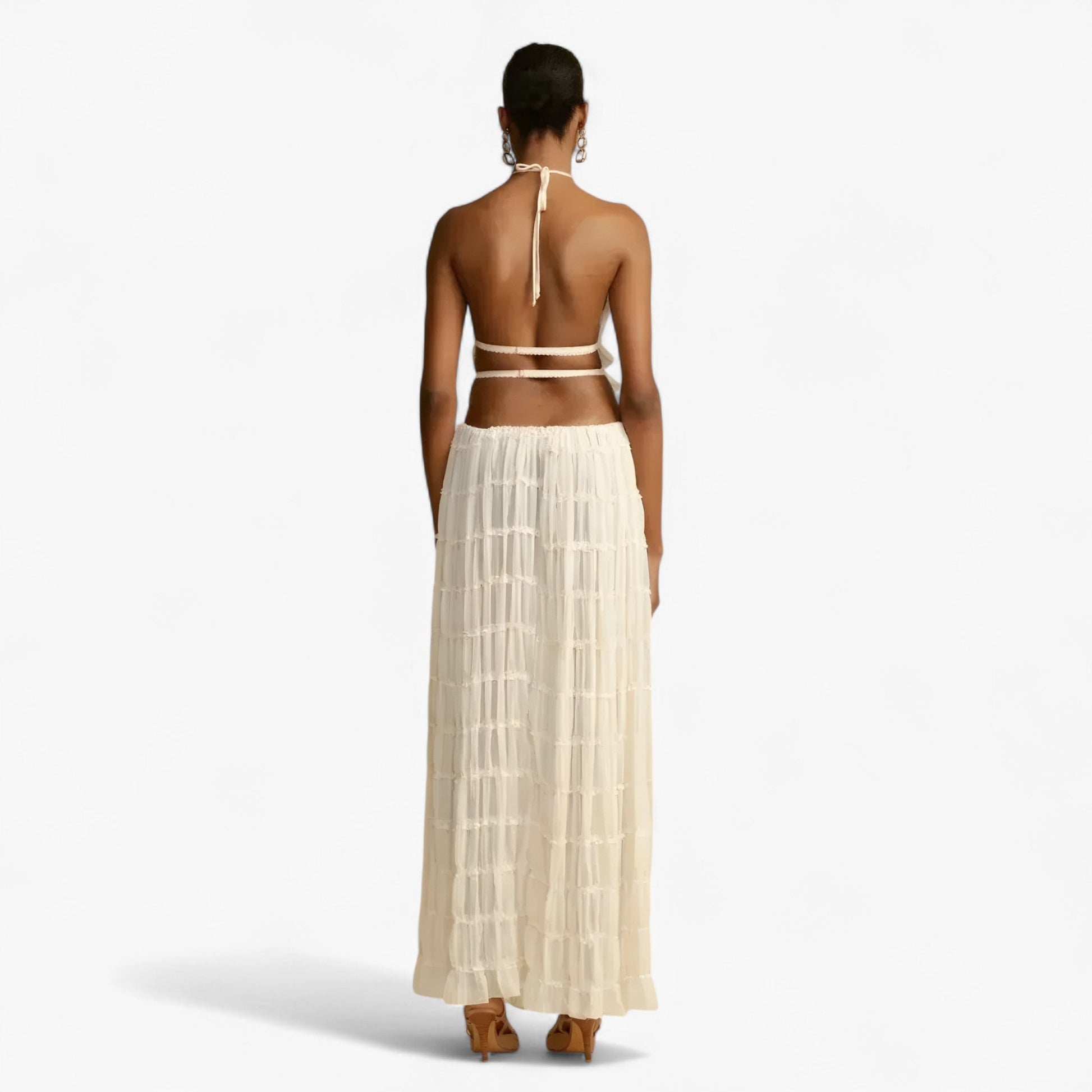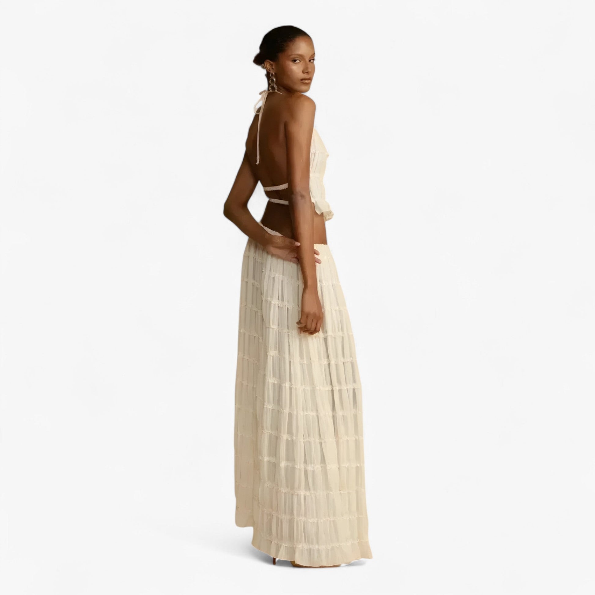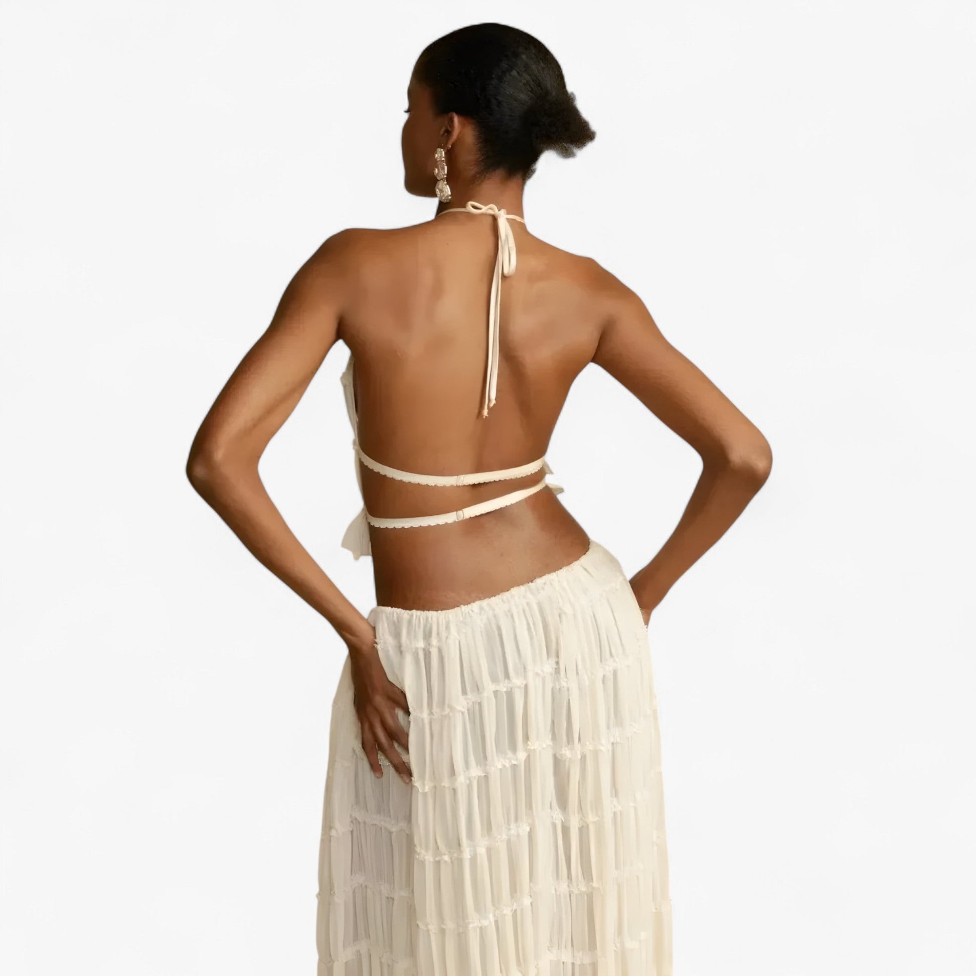 Das Freya-Set ist für sonnige Tage, laue Sommerabende und all die Momente entworfen, in denen du dich elegant fühlen willst, ohne auf Frische zu verzichten. Das offene Rückendesign lädt dazu ein, stilvoll aufzufallen.