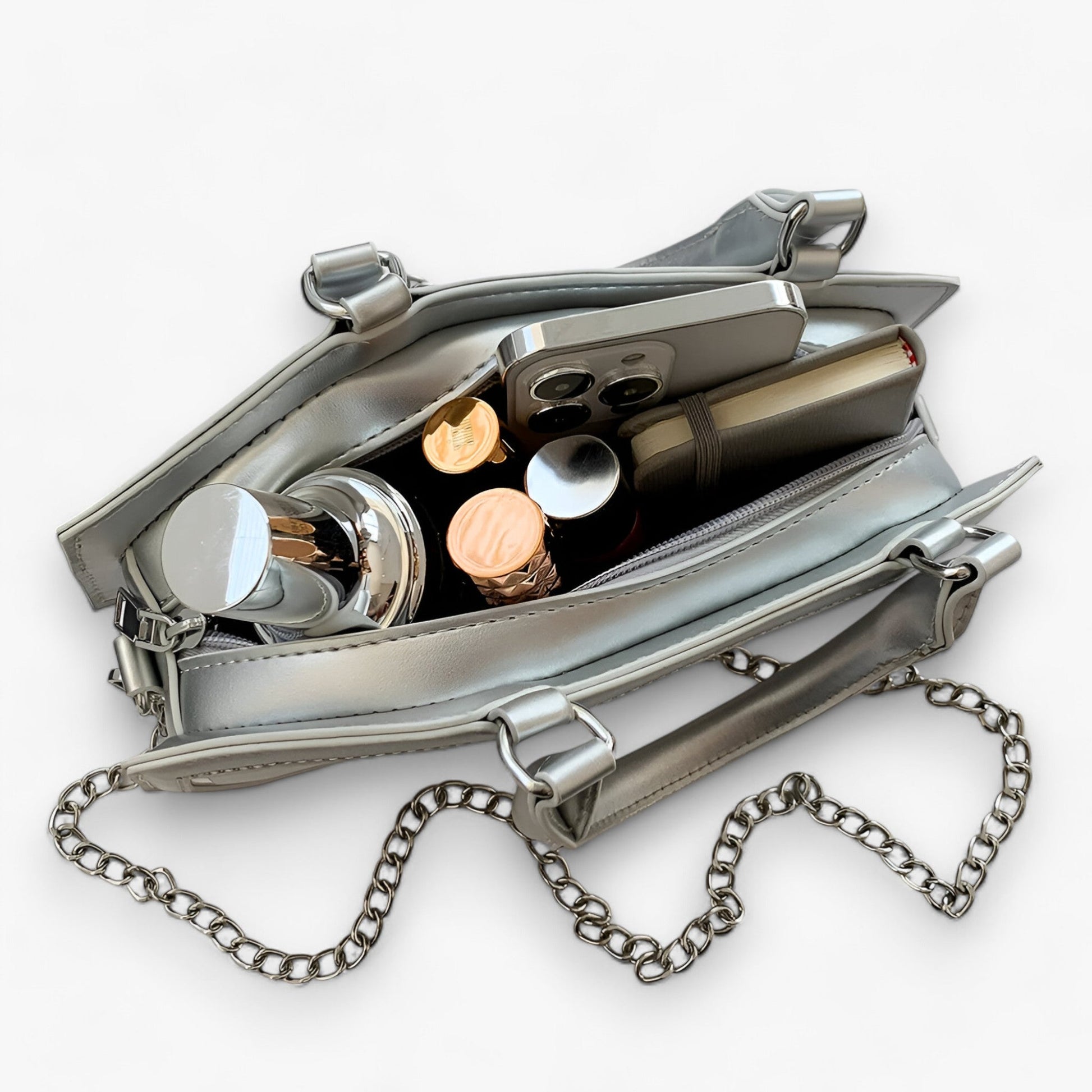 Der robuste Kettenriemen ermöglicht es dir, die Tasche bequem über der Schulter oder quer über den Körper zu tragen, sodass deine Hände frei bleiben, um die Festlichkeiten zu genießen. Der sichere Reißverschluss gewährleistet die Sicherheit deiner persönlichen Gegenstände während der ganzen Nacht.
