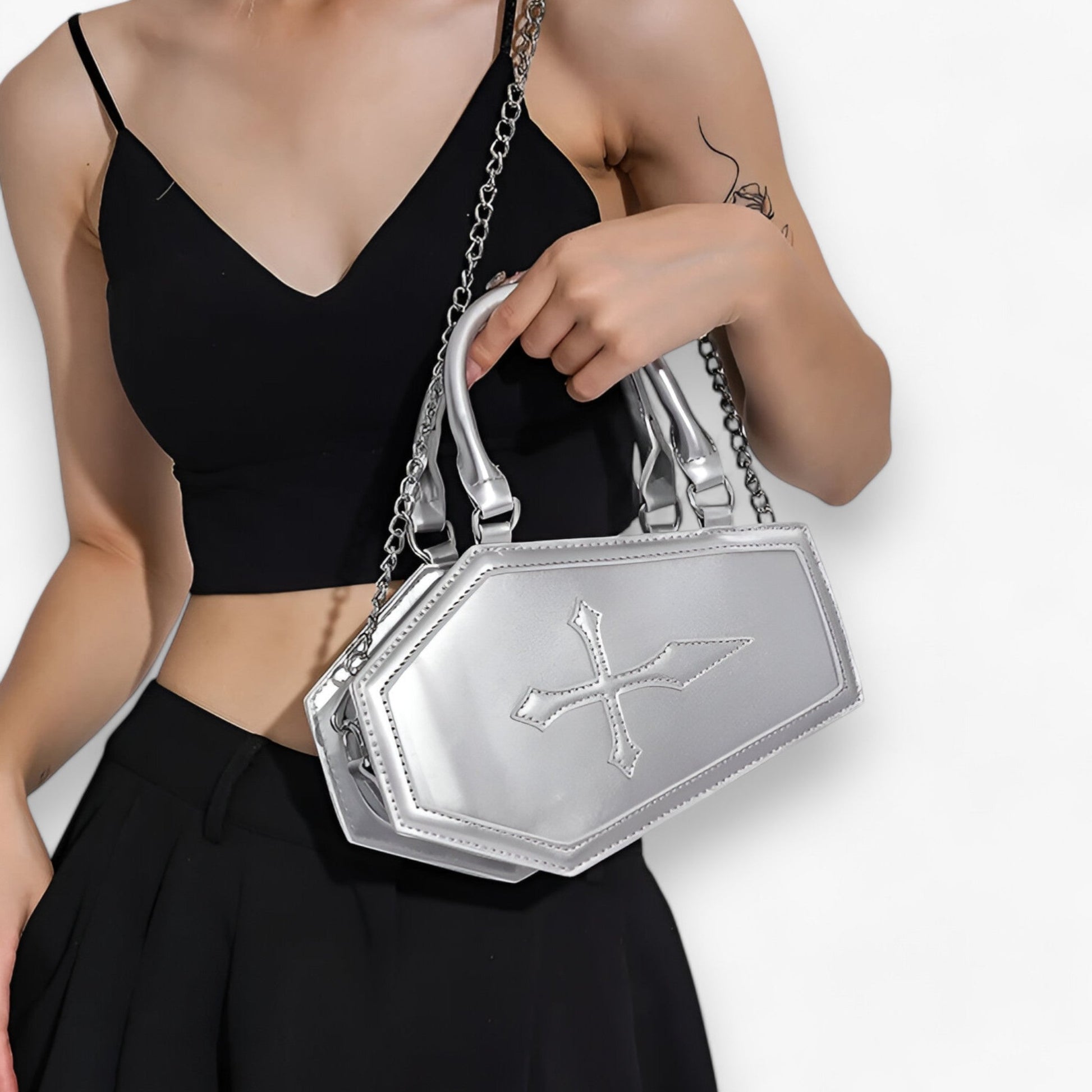 Vervollständige deinen Halloween-Look mit der Sarg-förmigen Kettentasche Grave. Sie ist nicht nur ein praktisches Accessoire, sondern auch ein Gesprächsthema, das dich auffallen lässt.