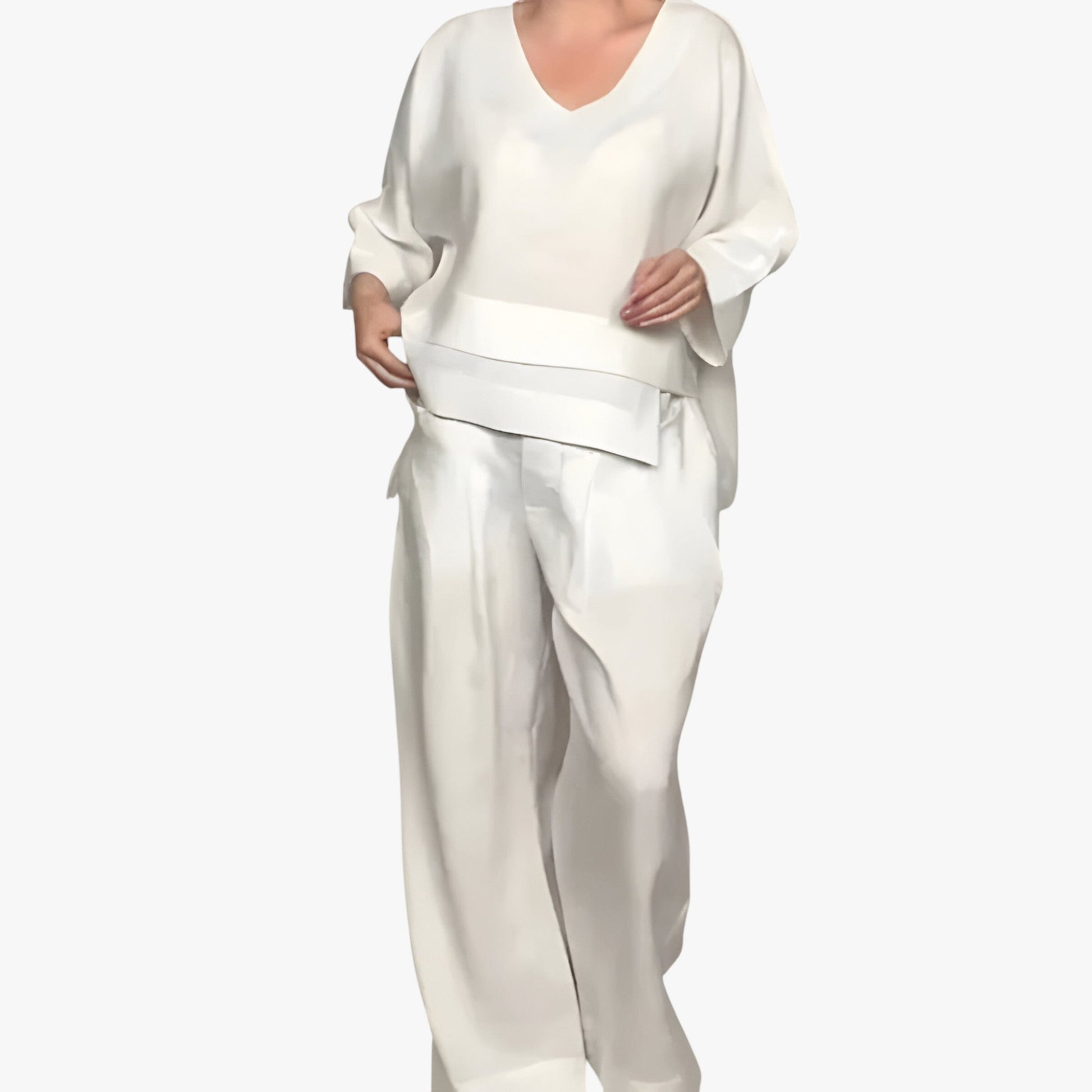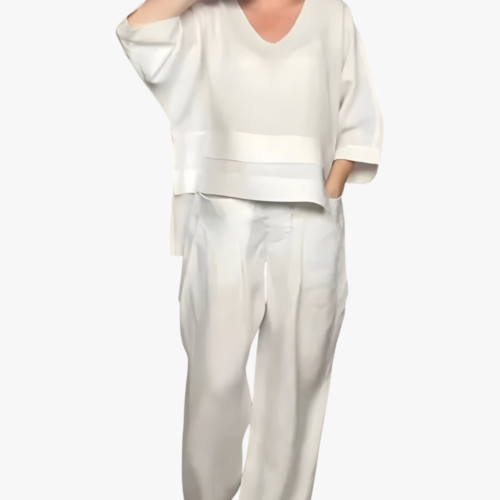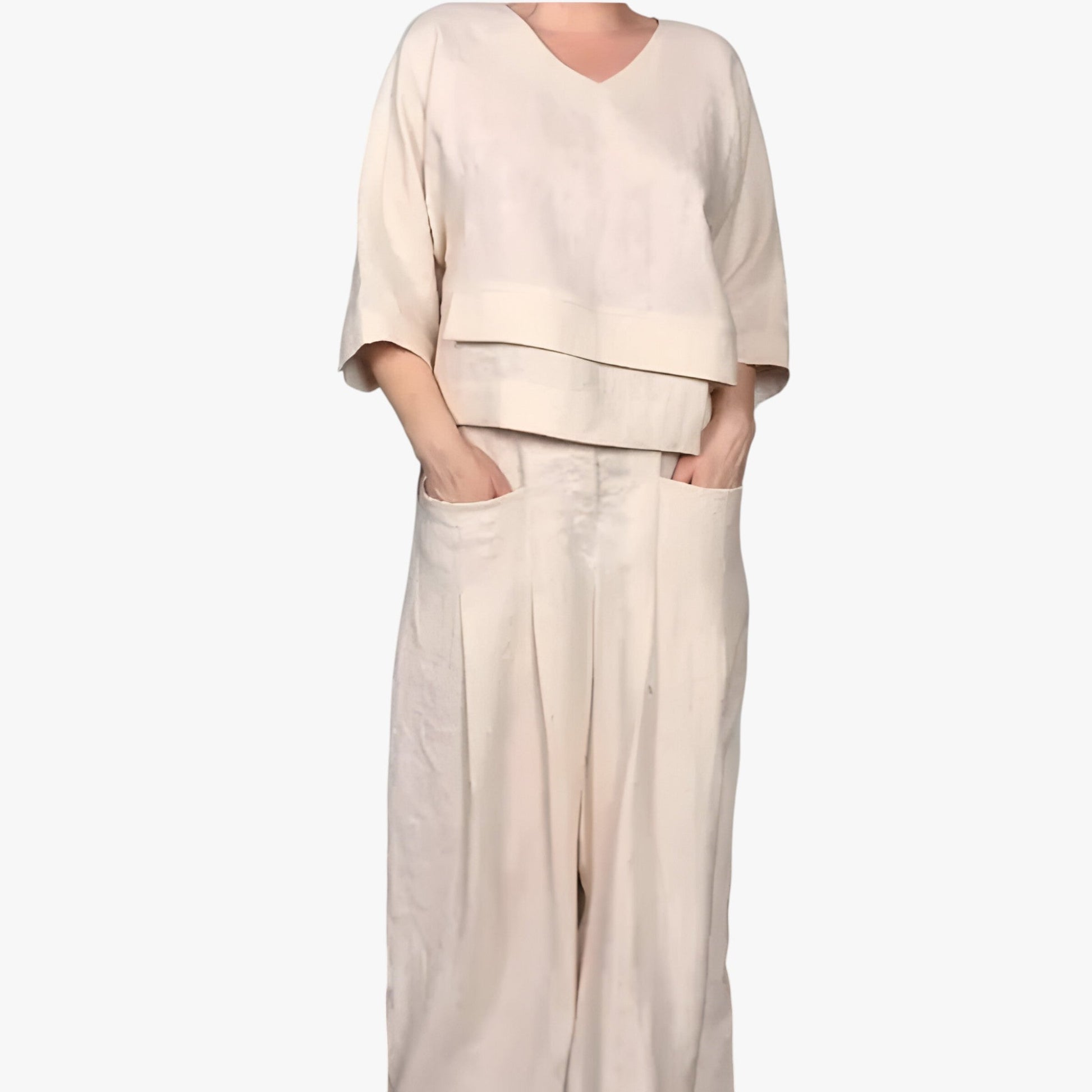 Erleben Sie die perfekte Mischung aus Stil und Komfort mit diesem einzigartigen Leinen-Set. Der asymmetrische Saum und der V-Ausschnitt sorgen für einen modernen Look, während das leichte Material sowohl an warmen Tagen als auch bei entspannten Indoor-Aktivitäten ideal ist.
