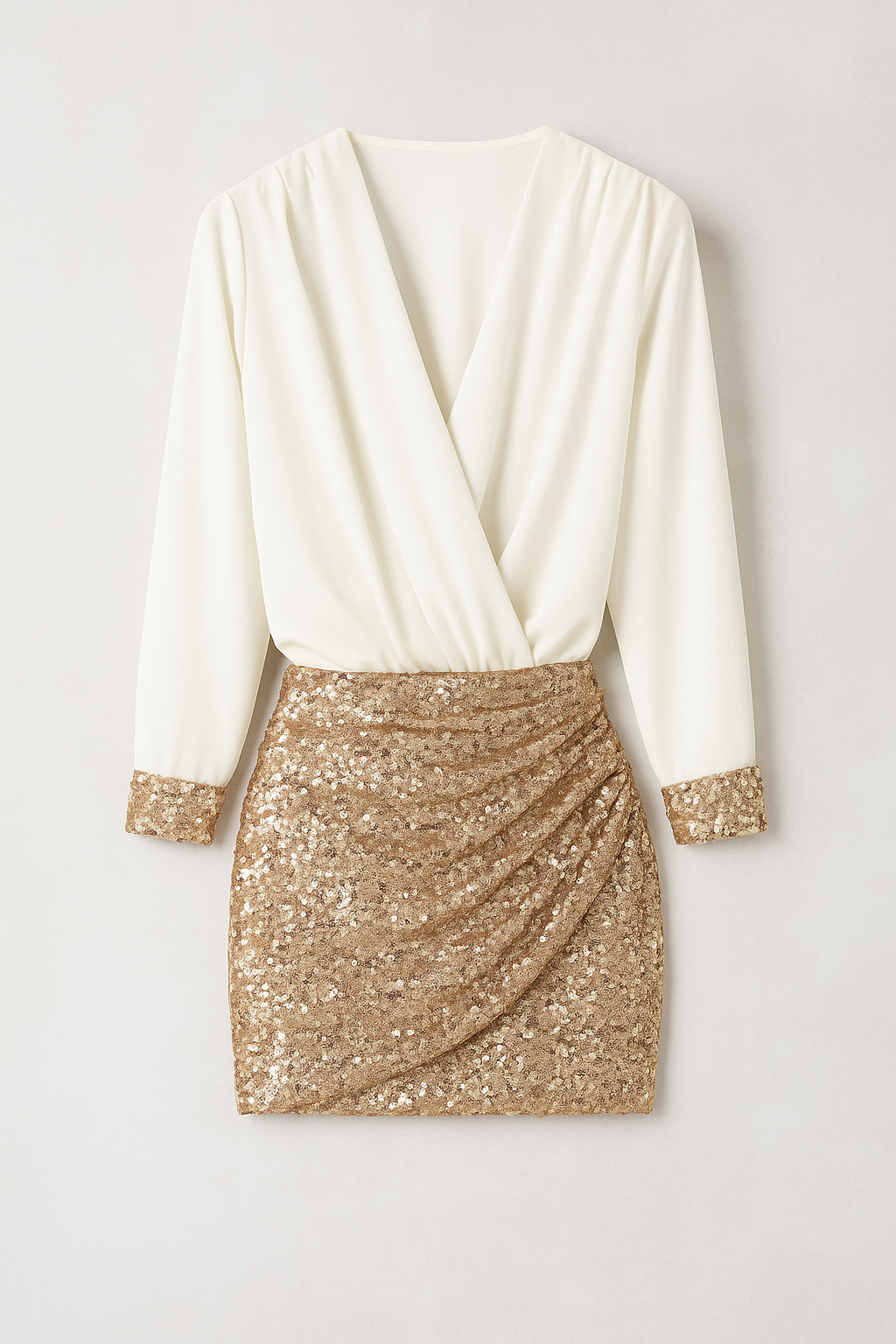 Glänze bei jedem Auftritt. Dieses Set kombiniert eine elegante weiße Wickelbluse mit einem funkelnden goldenen Pailletten-Minirock – perfekt für Partys, besondere Anlässe oder glamouröse Nächte in der Stadt. Zeige deine feminine Seite mit einem Look, der Stil und Selbstbewusstsein ausstrahlt.