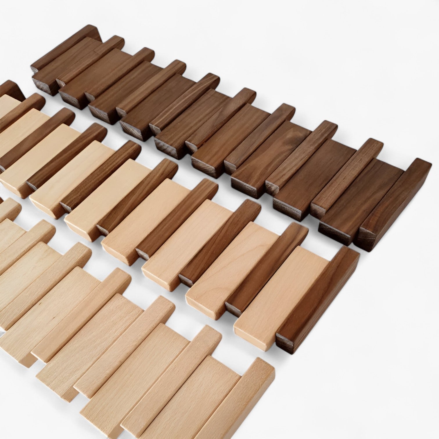 Bringen Sie musikinspirierte Eleganz in Ihr Zimmer mit dieser handgefertigten Holz-Garderobe in Form von Klaviertasten. Diese Wandgarderobe aus hochwertigem Buchen- und Kiefernholz vereint natürliche Schönheit mit beeindruckender Langlebigkeit und ist sowohl ein einzigartiges Kunstwerk als auch ein praktischer Organizer für jeden Raum.