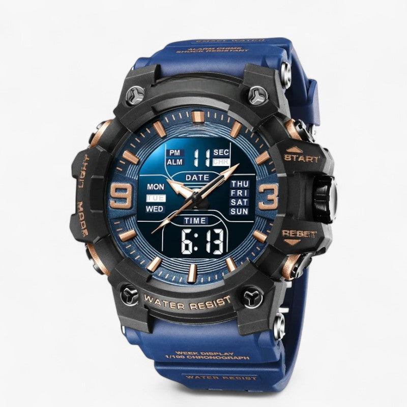 Eine Sportuhr, die mit deinem Tempo mithält. Ob du trainierst, reist oder deinen Tag planst – diese robuste und wasserdichte Uhr vereint Stil mit Funktionalität.