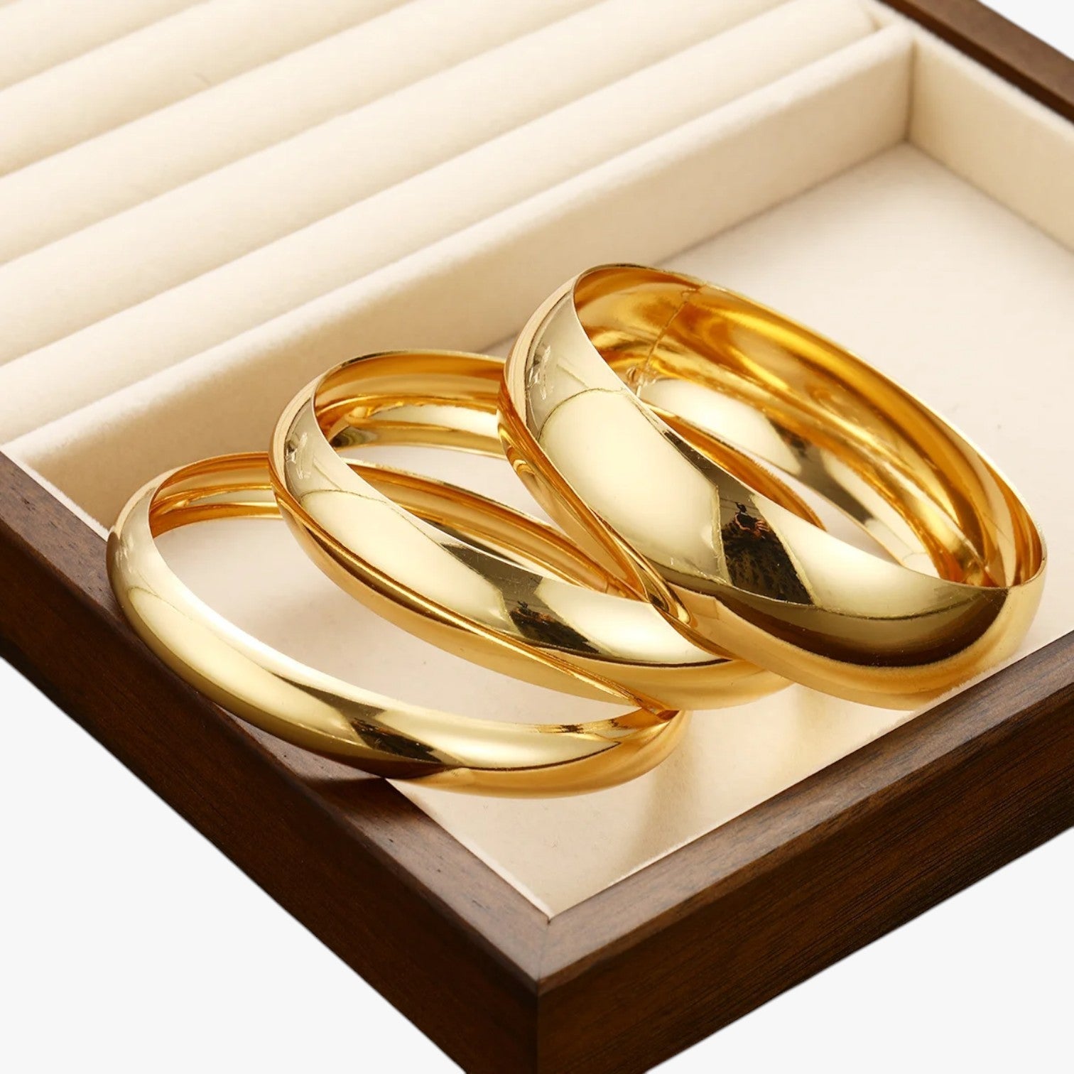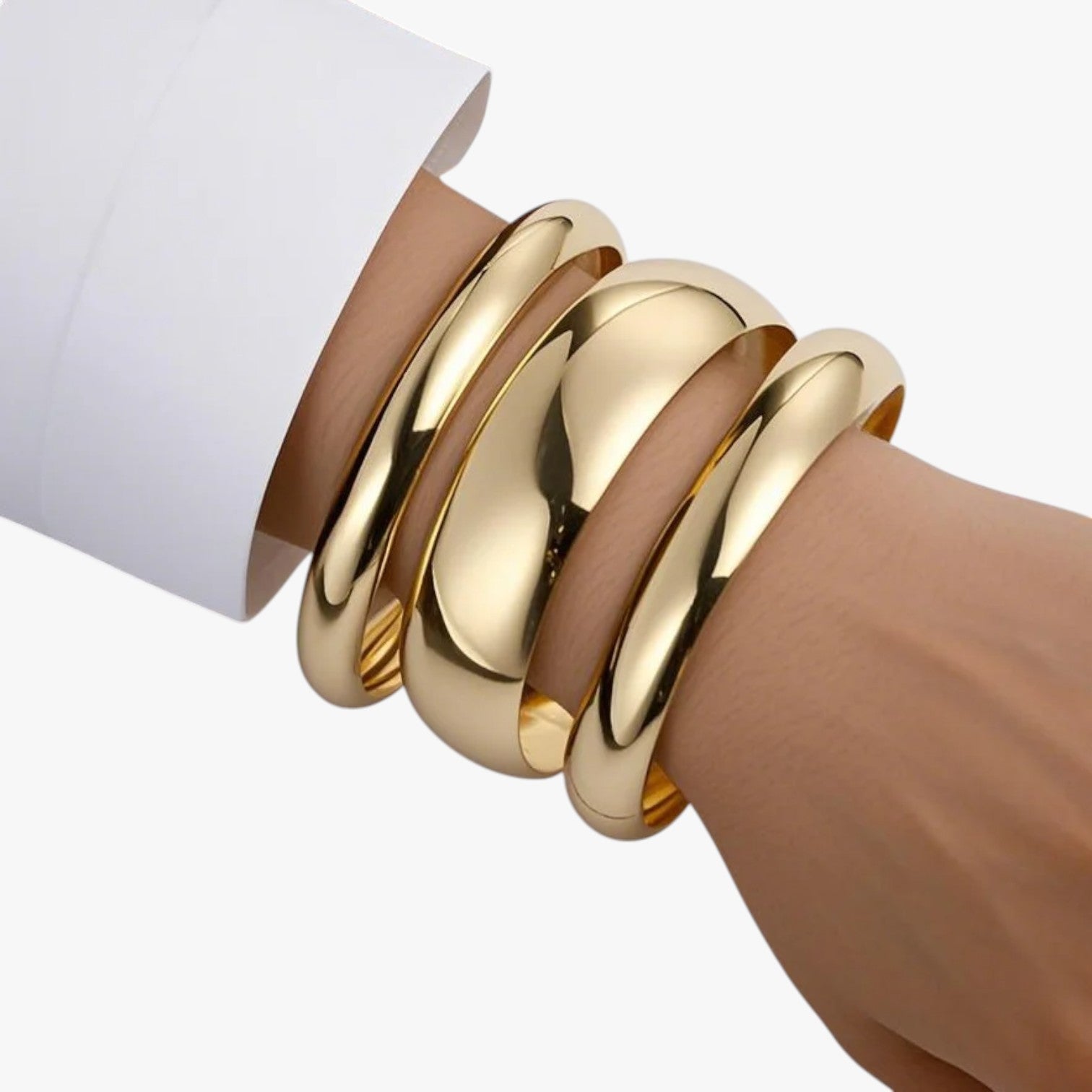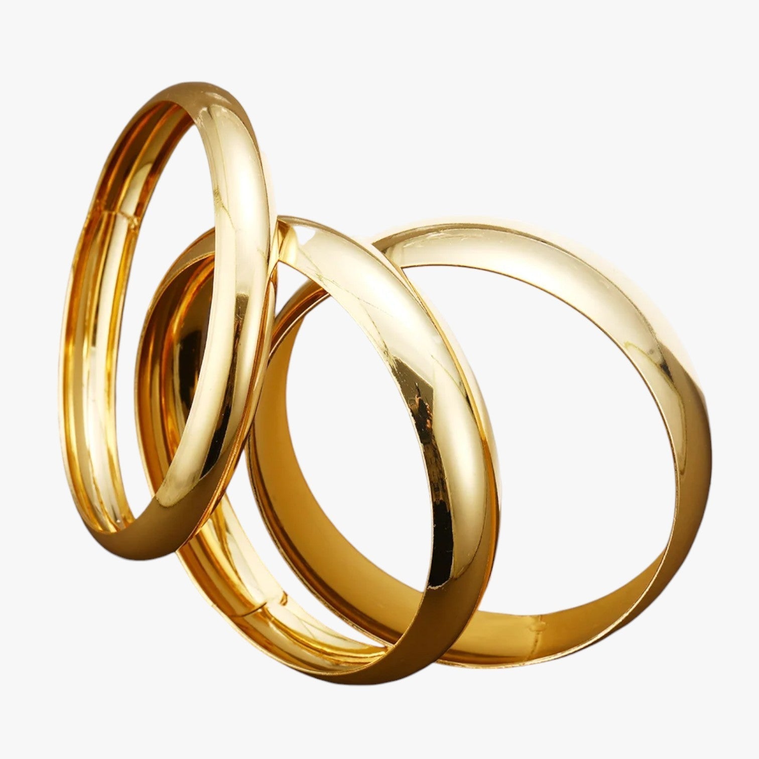 Drei breite Armbänder in klassischem Gold für einen Look, der nicht unbemerkt bleibt.