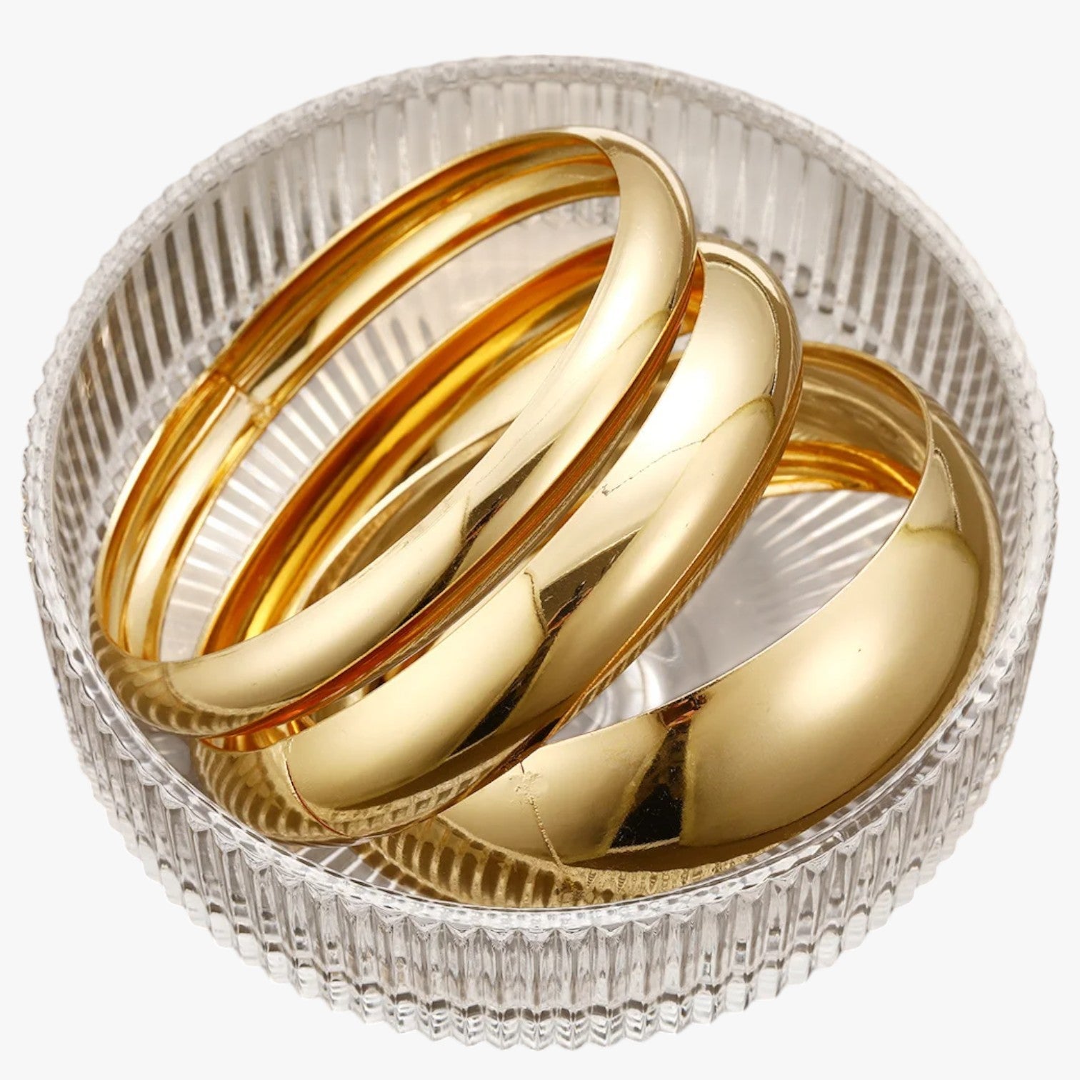 Diese goldenen Armreifen sind auffällig, klobig und glänzend. Der perfekte Abschluss für einen selbstbewussten, eleganten Look.