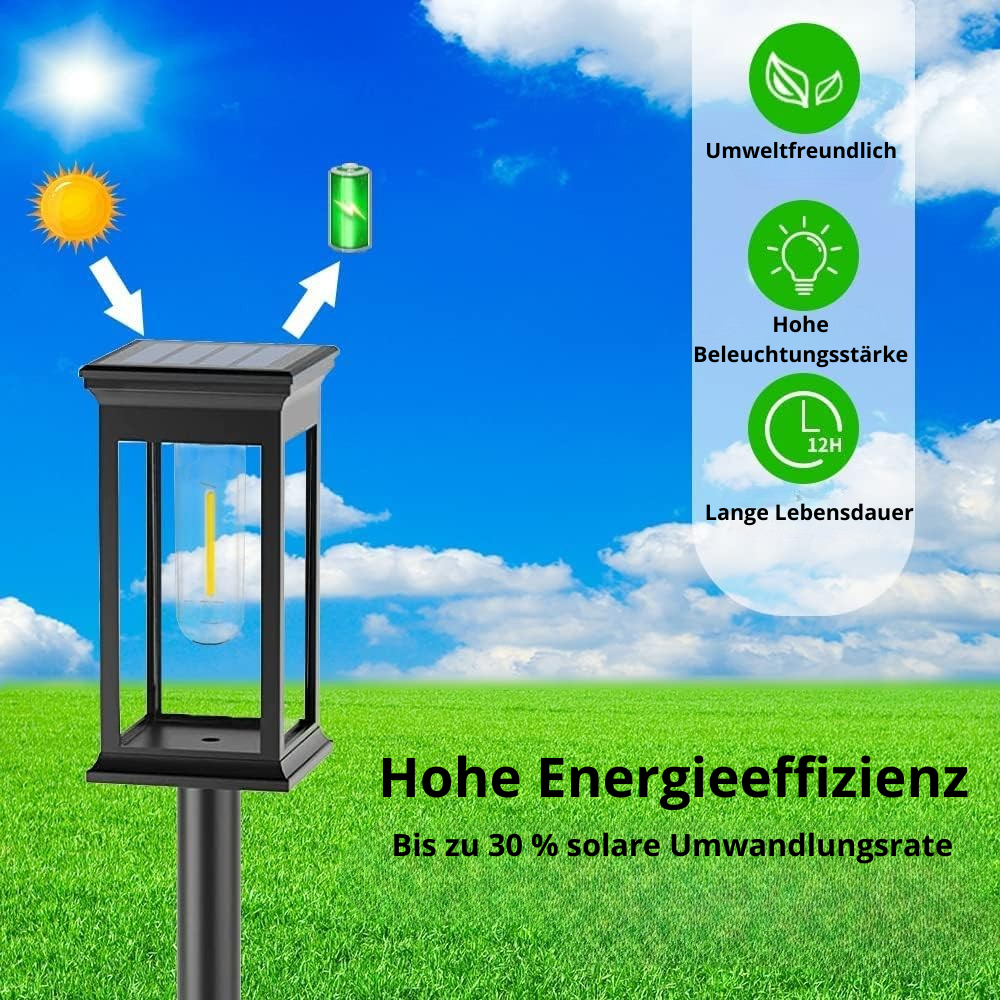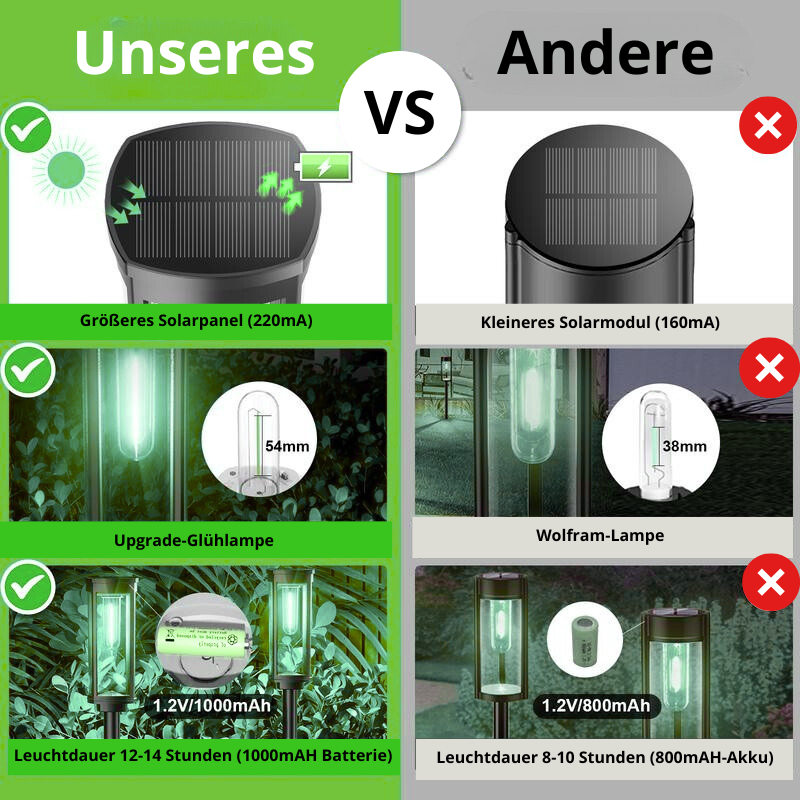 NACHHALTIGE Solar-Gartenleuchten - Im Gegensatz zu typischen Solar-Wegleuchten sind die Solar-Gartenleuchten mit einer leistungsstarken, wiederaufladbaren 3,7V/1,85Wh-Batterie ausgestattet. Sie bietet bis zu 12 Stunden Beleuchtung nach einer vollen Ladung und schaltet sich nachts automatisch ein. Unsere Solarwegleuchten sind mit intelligenten Lichtsensoren ausgestattet, die sich nachts bei Sonnenaufgang automatisch ein- und ausschalten.