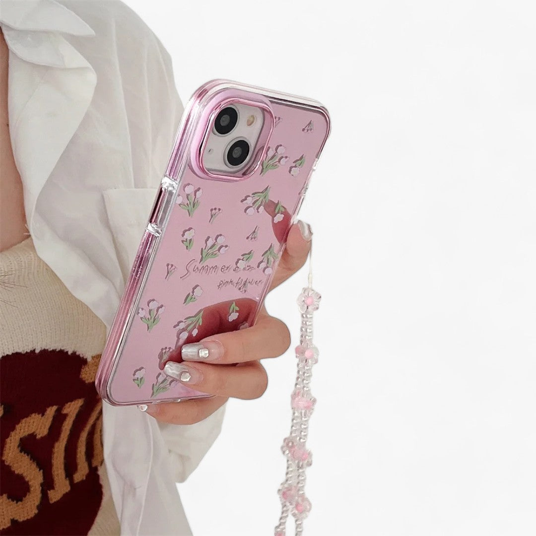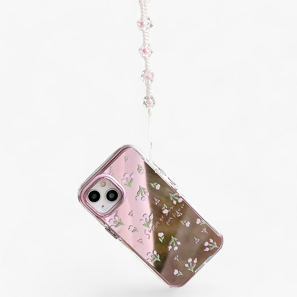 Luxuriöses Rosa | Spiegelblumen-iPhone-Hülle - Hübsche Perlenkette