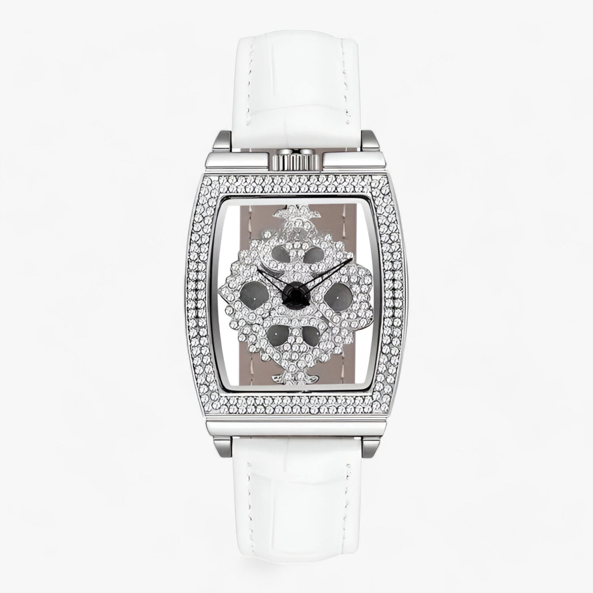 Die hochwertige Luxus-Quartz-Uhr ist ein atemberaubendes Accessoire mit einem drehbaren Diamantzifferblatt, verziert mit Strass, und einem modischen weißen Lederarmband. Entworfen mit einem Tonneau-Skeleton-Zifferblatt, bietet diese Uhr sowohl Raffinesse als auch einzigartigen Stil.