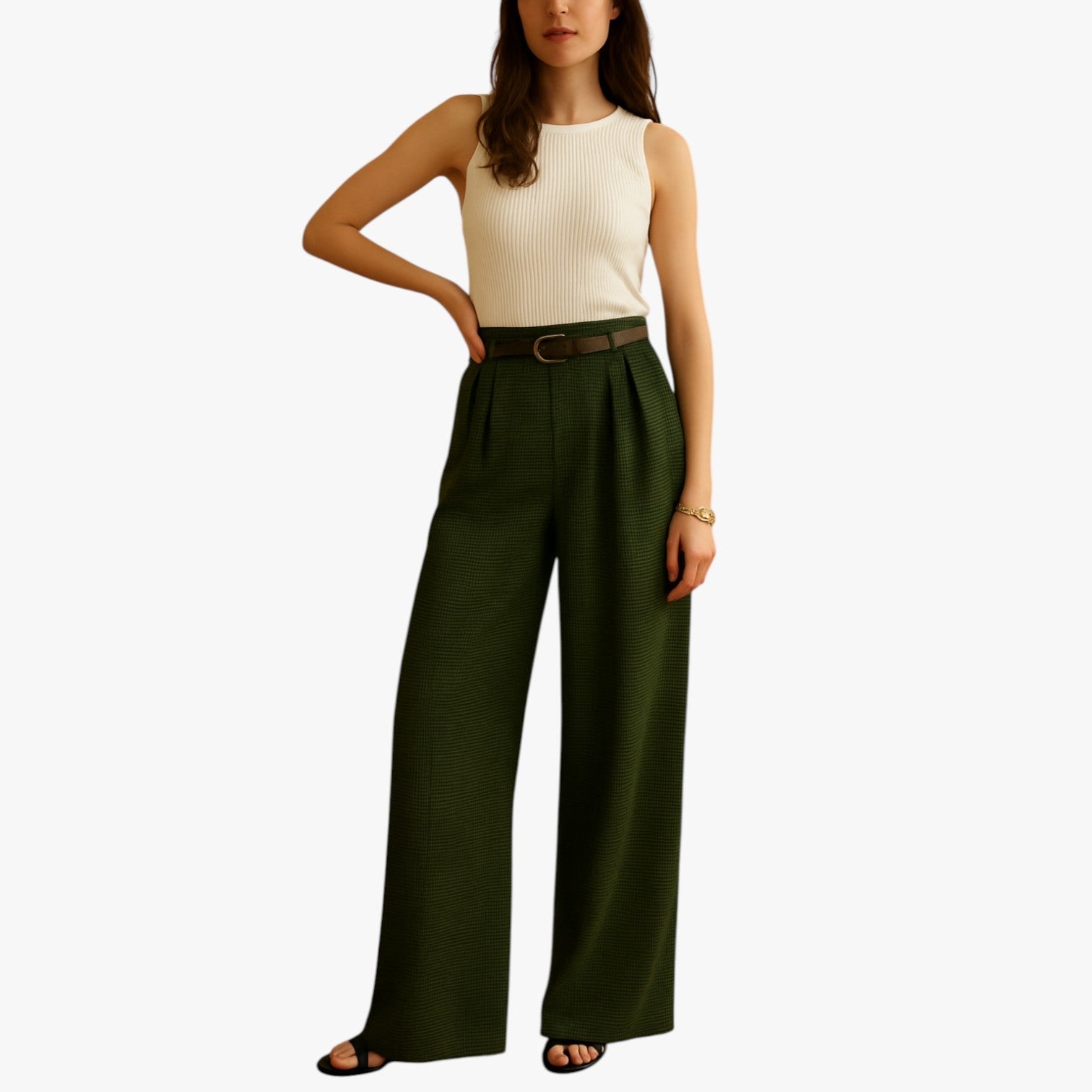 Schlüpfe in eine Hose, die die Figur streckt, die Taille betont und zu allem passt – mit formgebendem Gürtel, Retro-Schnitt und auffälligem Karomuster voller Persönlichkeit.