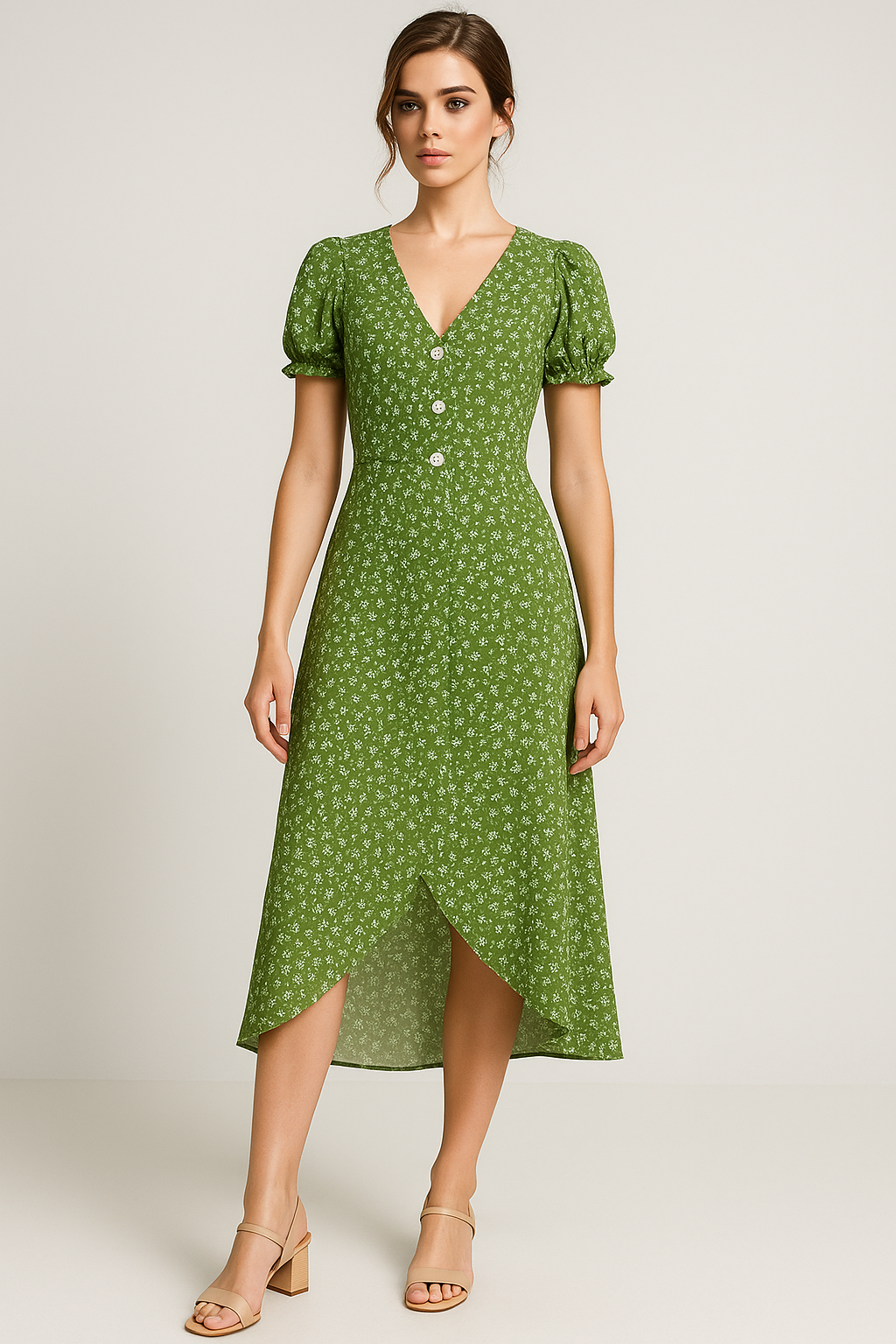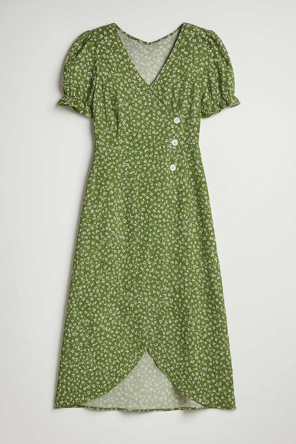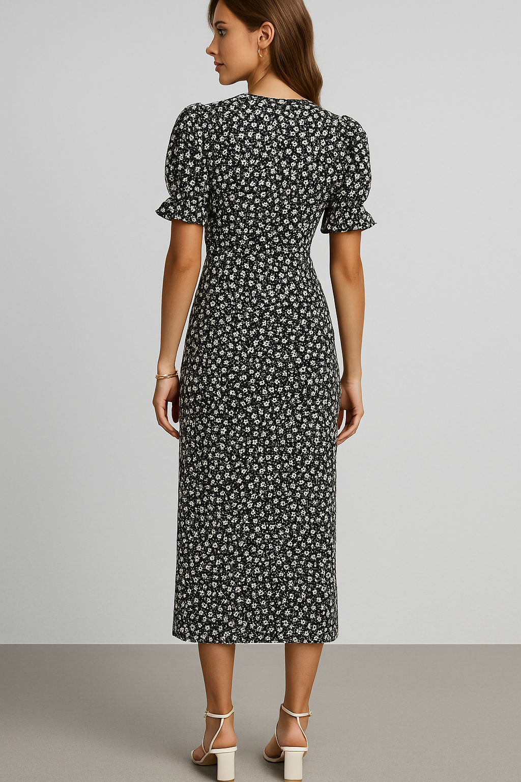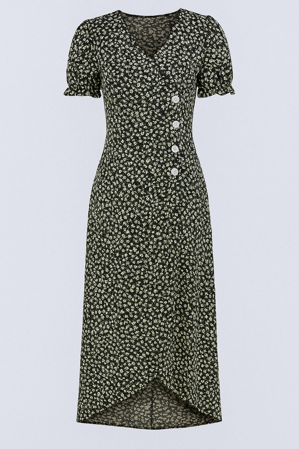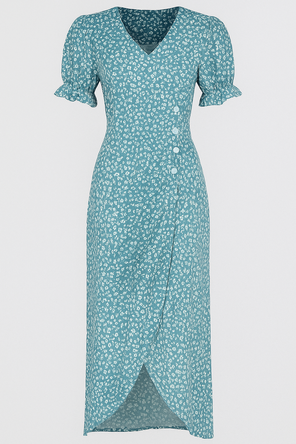 Der V-Ausschnitt betont das Dekolleté dezent, während die gerafften Ärmel und die seitlichen Knöpfe einen unwiderstehlichen Vintage-Touch verleihen. Der Midi-Schnitt mit überkreuztem Saum lässt die Figur schlank wirken und begleitet jeden Schritt mit Leichtigkeit und Anmut.