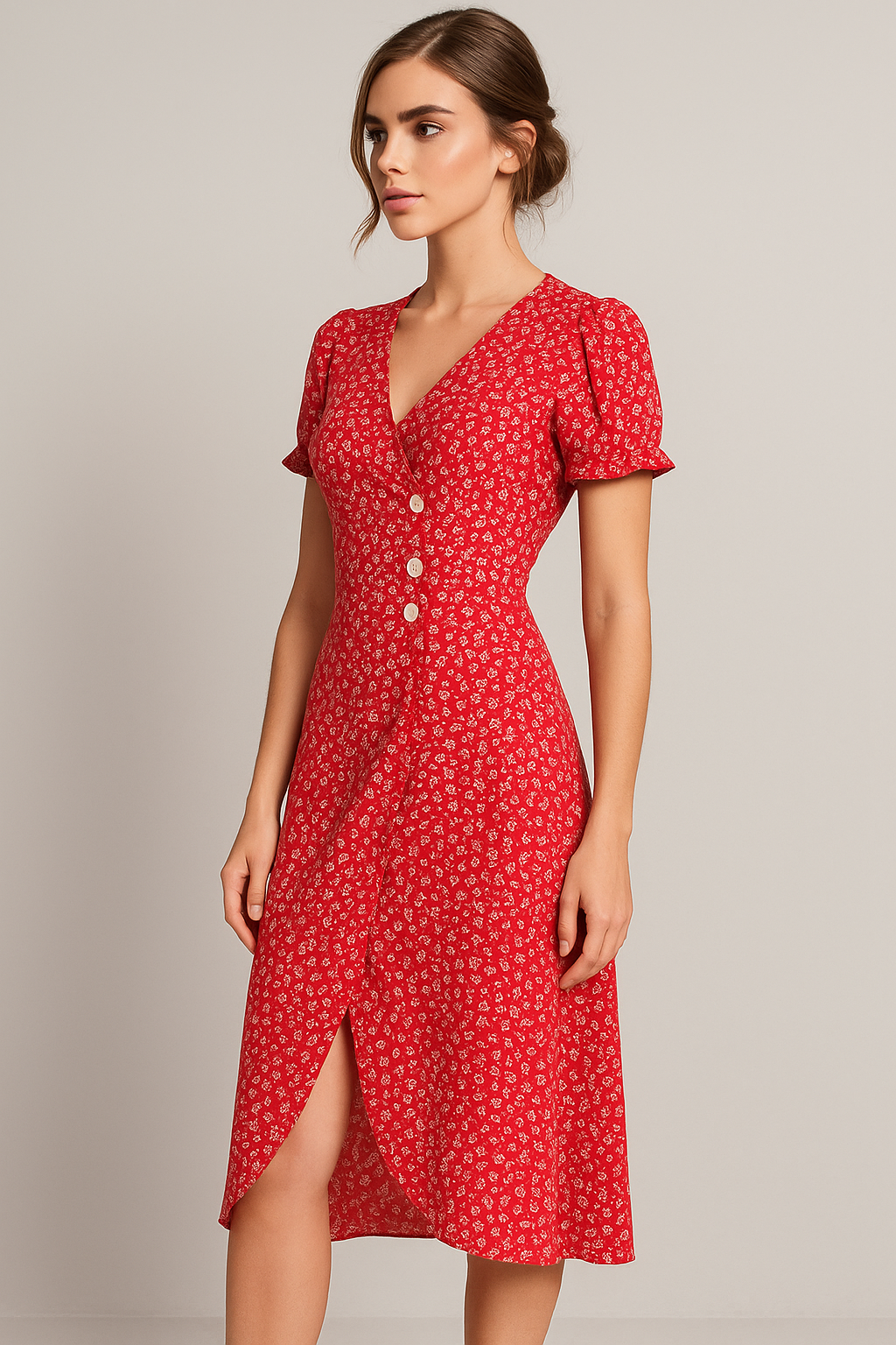 Marie | Geblümtes Midikleid mit V-Ausschnitt und seitlichen Knöpfen