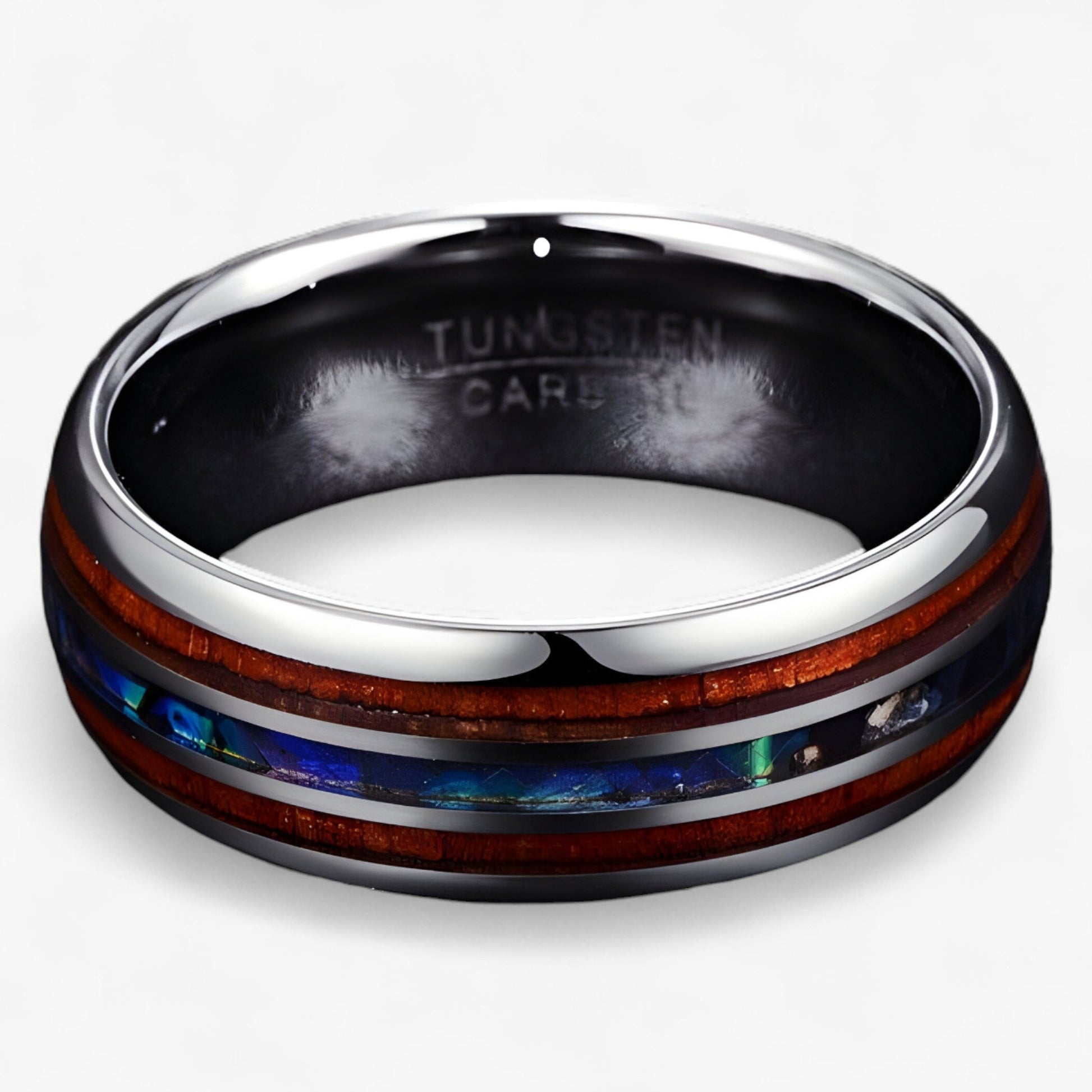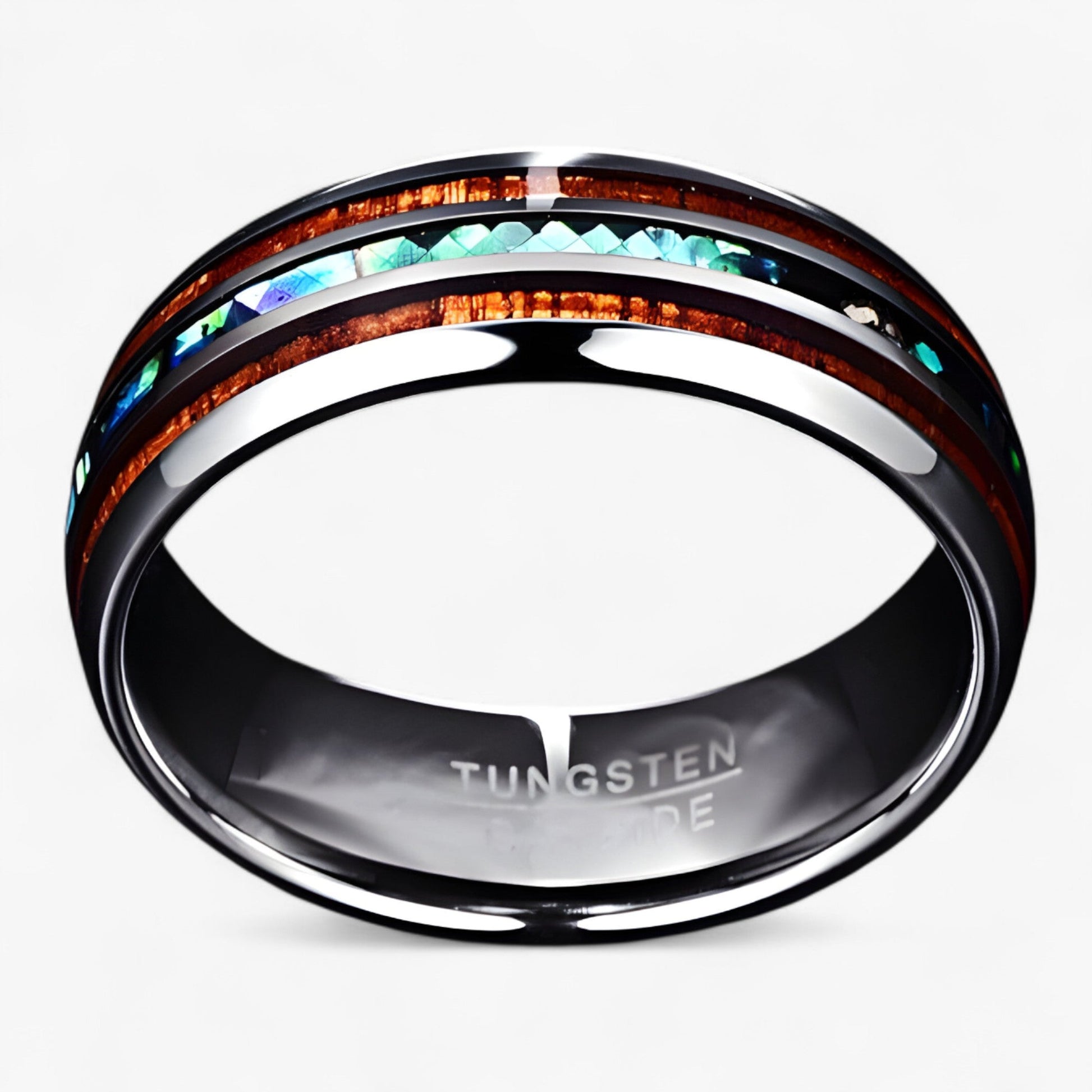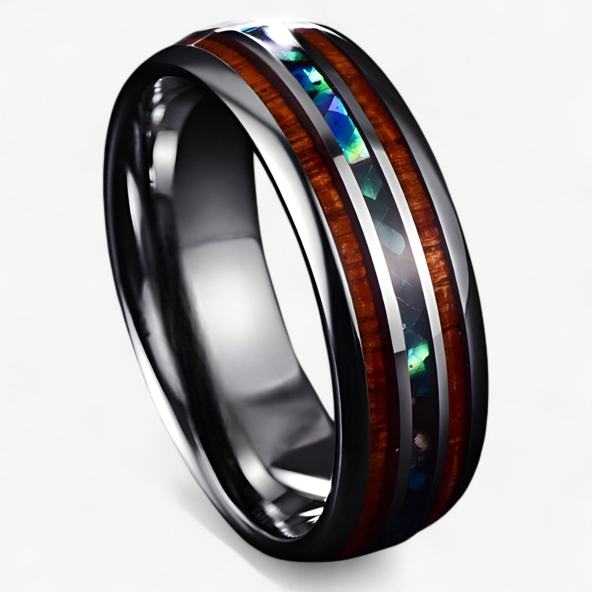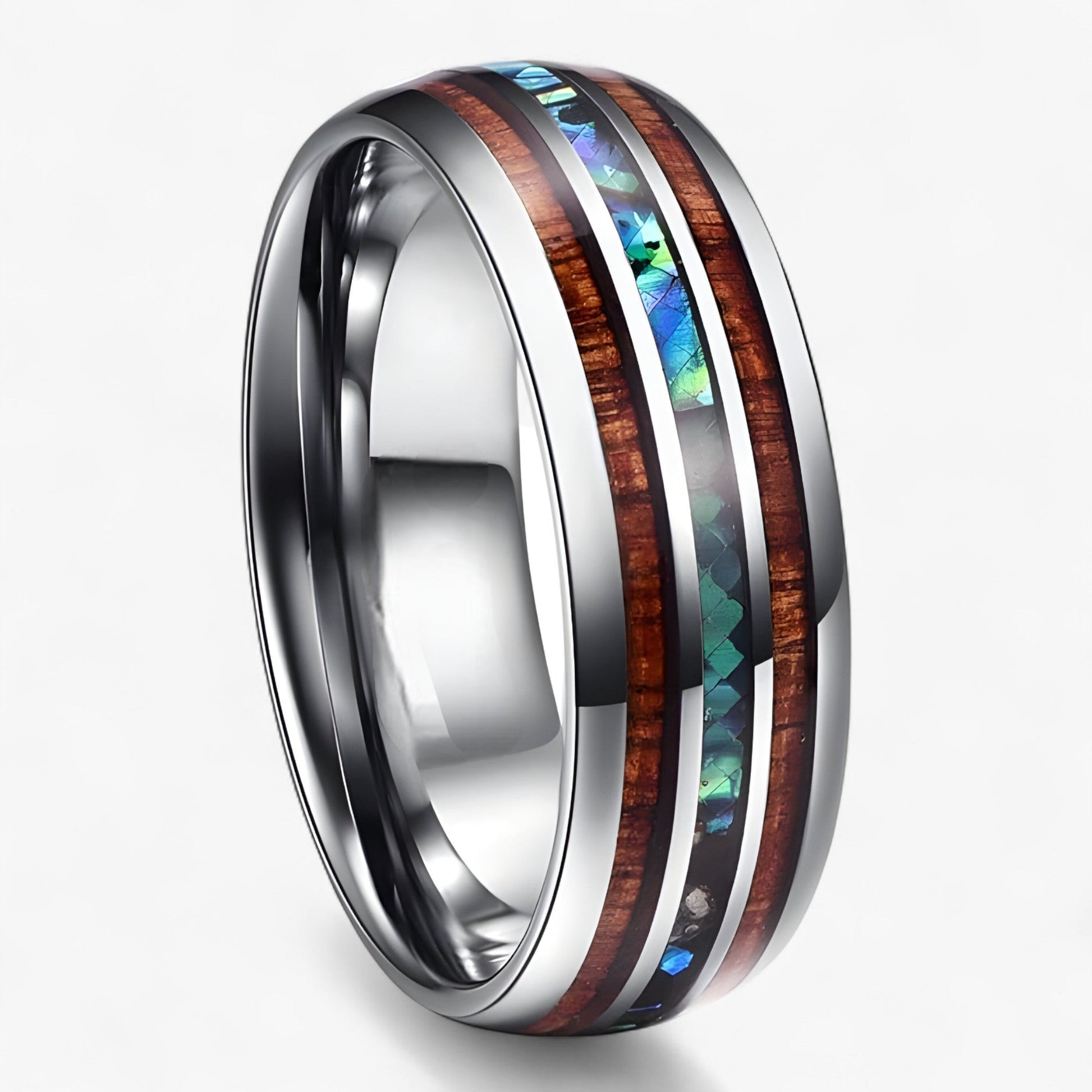 - Hawaiianische Koa-Holz-Einlage: Das hawaiianische Koa-Holz ist beidseitig neben der Abalone-Muschel eingesetzt und verleiht dem Ring zusätzlichen Stil.