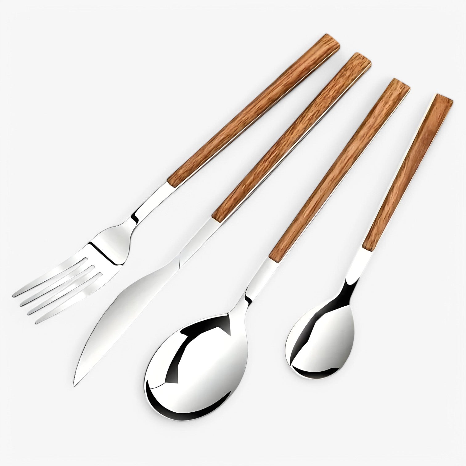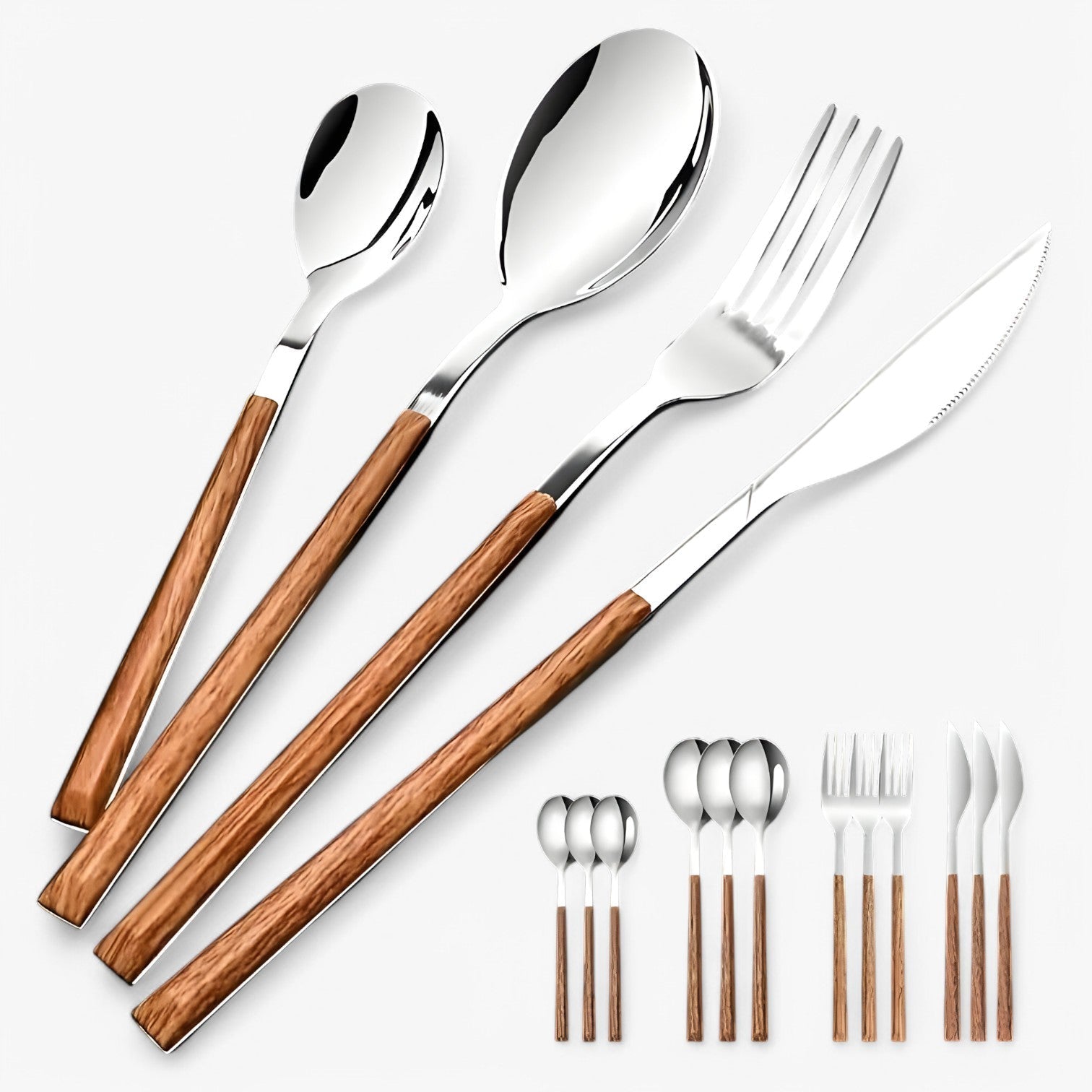 Decken Sie Ihren Tisch mit Besteck, das sich ebenso gut anfühlt, wie es aussieht. Warme Holzgriffe, eleganter Edelstahl—pure Raffinesse bei jeder Mahlzeit.