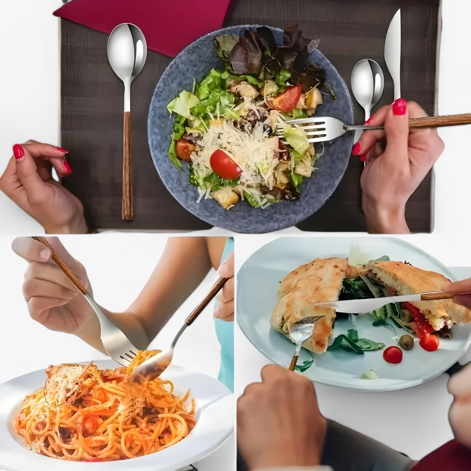 Die reichhaltigen Holzgriffe verleihen Ihrem Tisch einen natürlichen Charme. Sie sehen nicht nur wunderschön aus, sondern bieten auch einen komfortablen Griff, wodurch jeder Bissen mühelos erscheint.