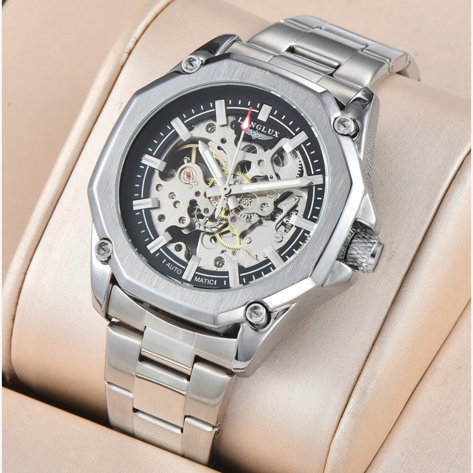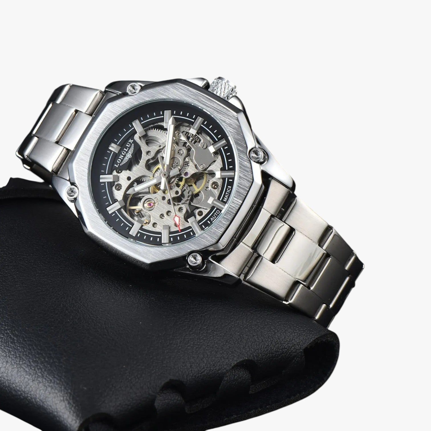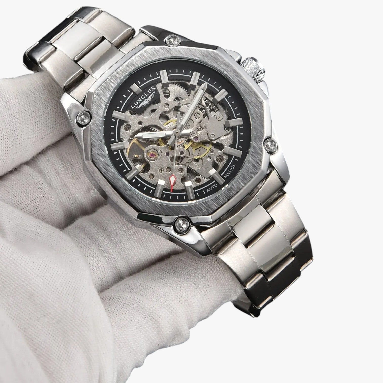 Das skelettierte Zifferblatt zeigt jedes Zahnrad in Bewegung. Jede Sekunde wird zu einer kleinen Show, die du tragen kannst.