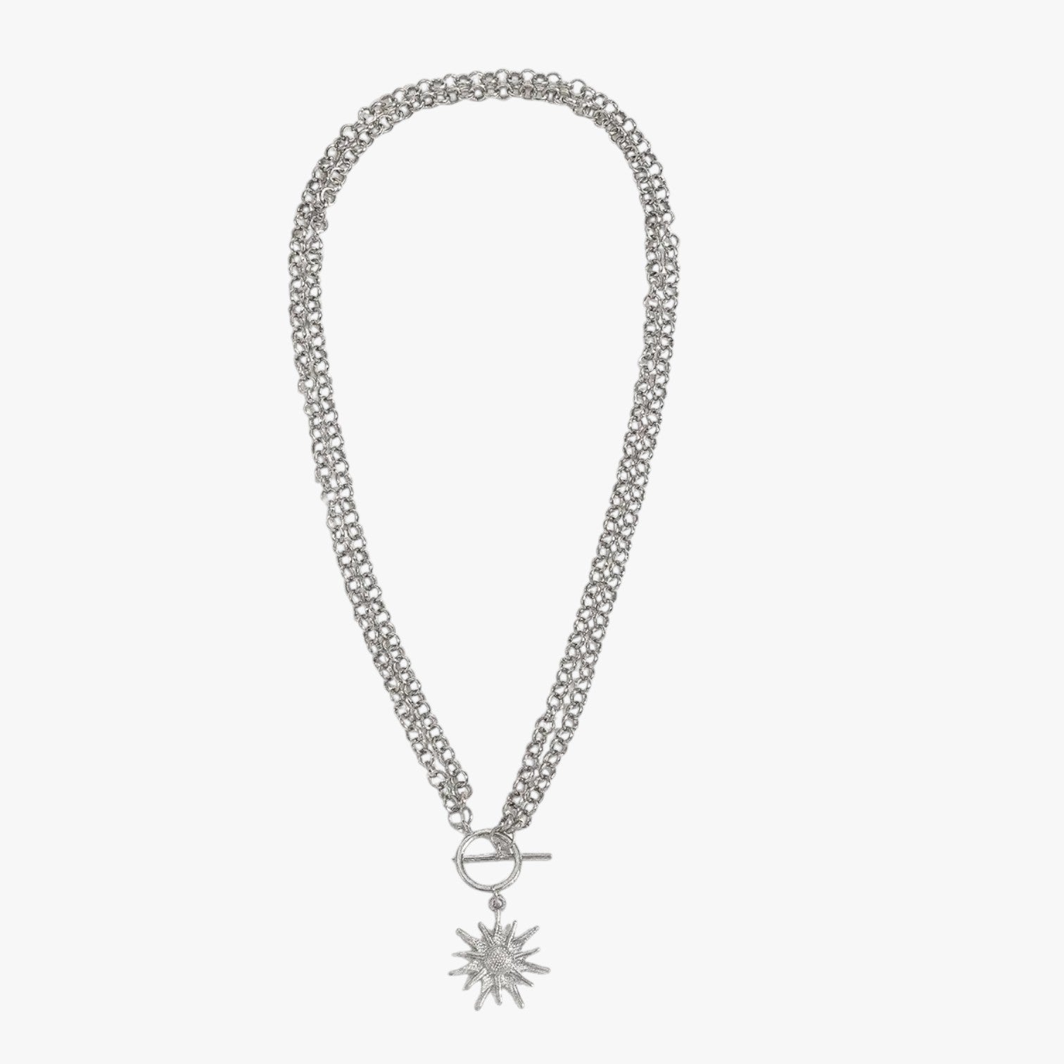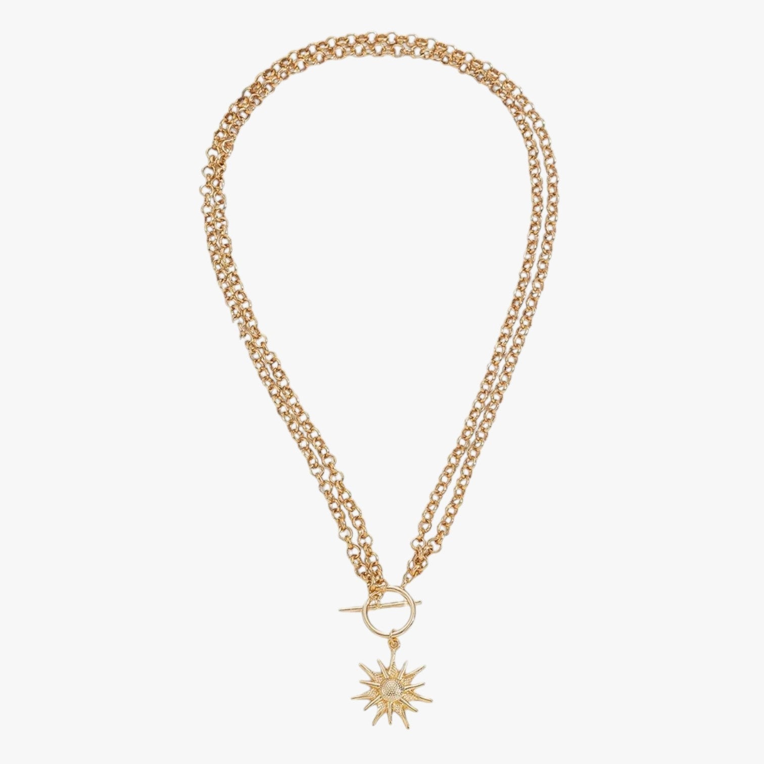 Der große Anhänger in Sonnenform ist dazu gemacht, hervorzustechen. Er verwandelt dein Dekolleté in einen Brennpunkt aus Energie, Stärke und persönlichem Stil.