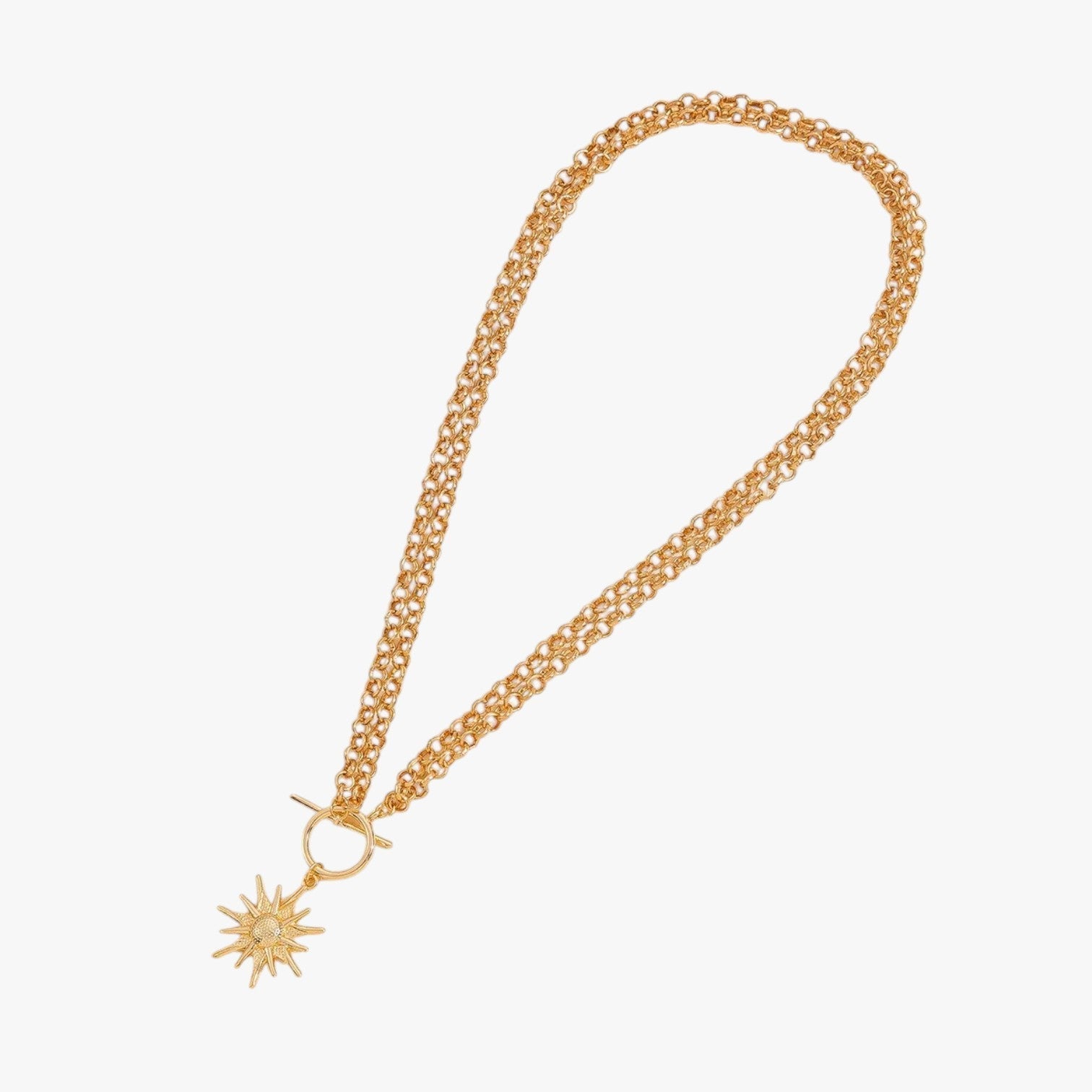 Stell dir vor, du betrittst einen Raum: Das Outfit ist schlicht, aber diese Halskette an deinem Hals zieht alle Blicke auf sich. Die Sonne strahlt im Mittelpunkt, reflektiert das Licht… und die Aufmerksamkeit.