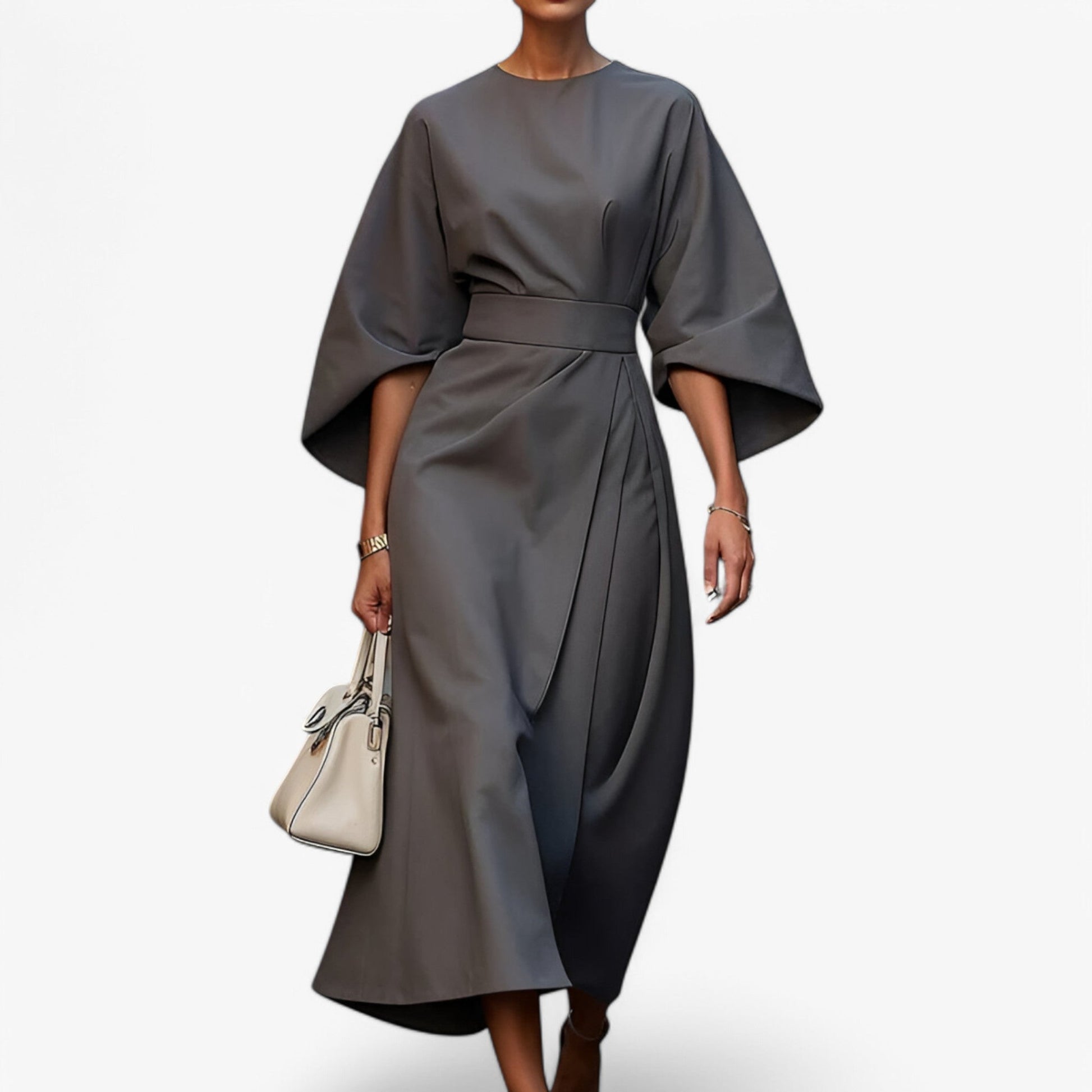 Mit einem definierten Taillengürtel und voluminösen Ärmeln betont dieses Kleid genau die richtigen Stellen und erschafft eine Silhouette, die sowohl strukturiert als auch feminin ist.