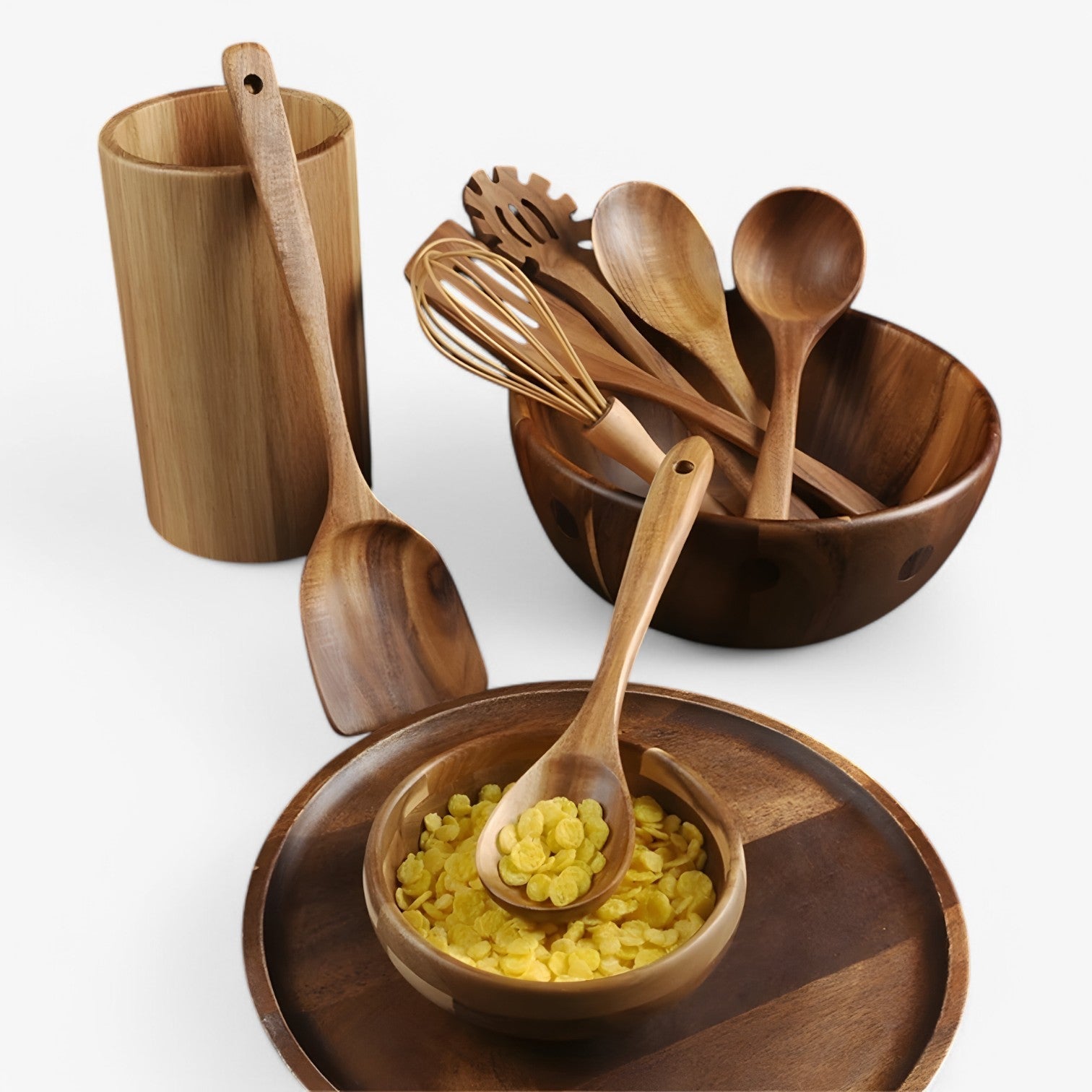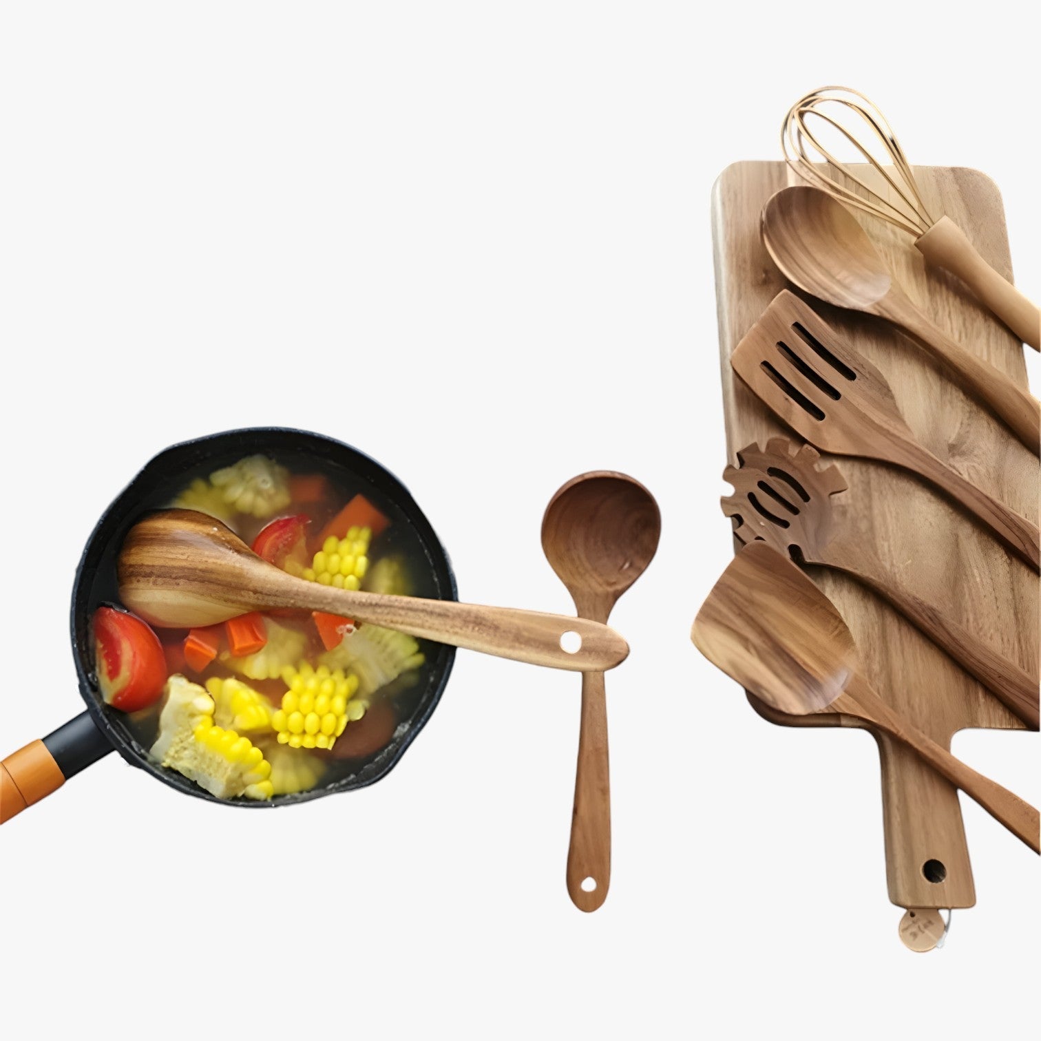Mache jedes Kocherlebnis zu einer Freude mit diesem stilvollen und nachhaltigen Küchenutensilien-Set aus Holz!