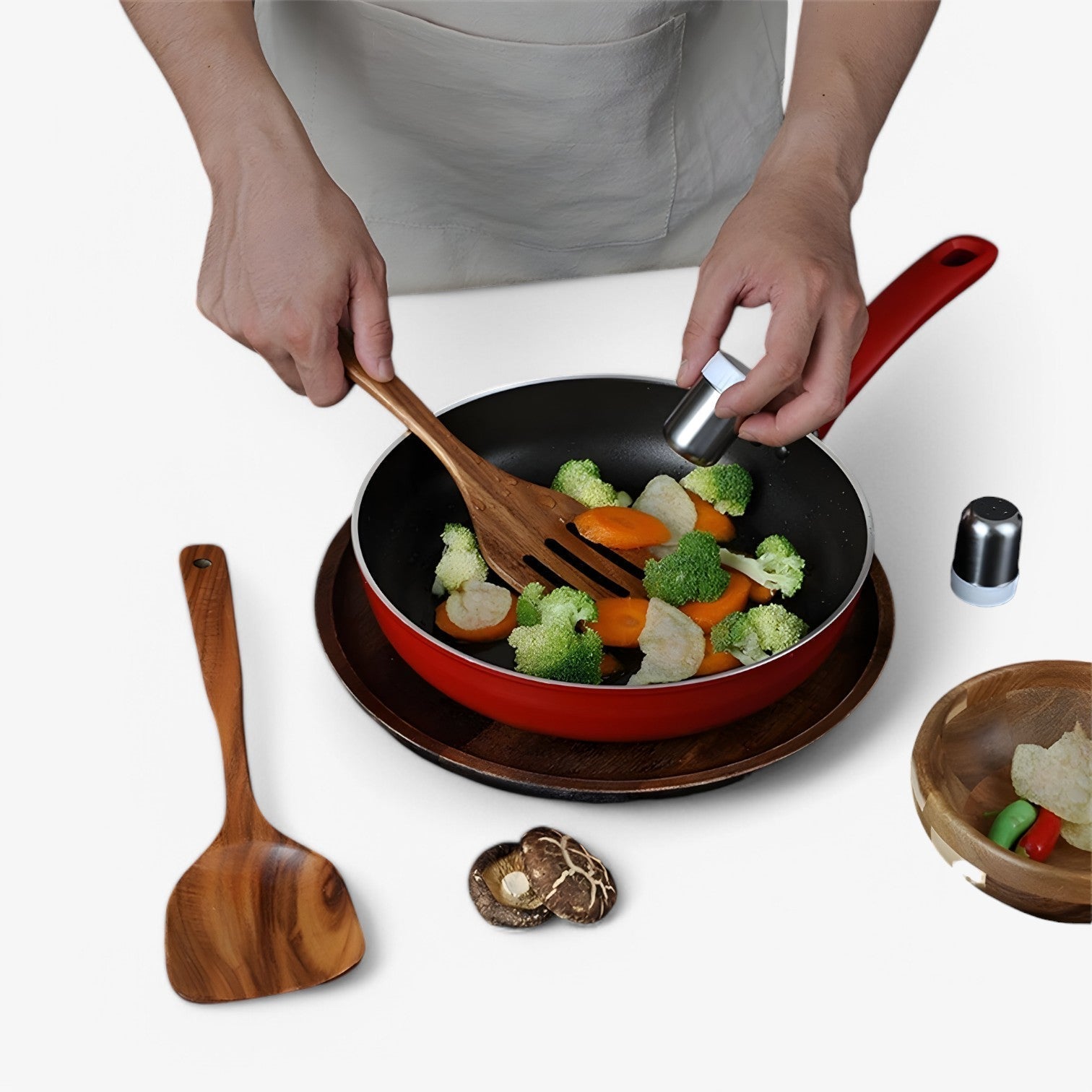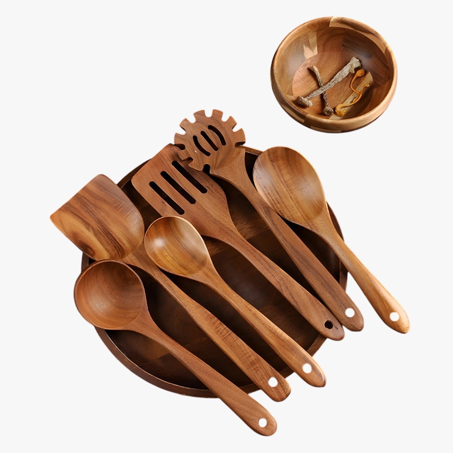 Rühren, Schöpfen und Servieren ganz mühelos mit wunderschönen Küchenutensilien aus Teakholz – keine Kratzer, keine schädlichen Stoffe, nur reines und nachhaltiges Kochen.