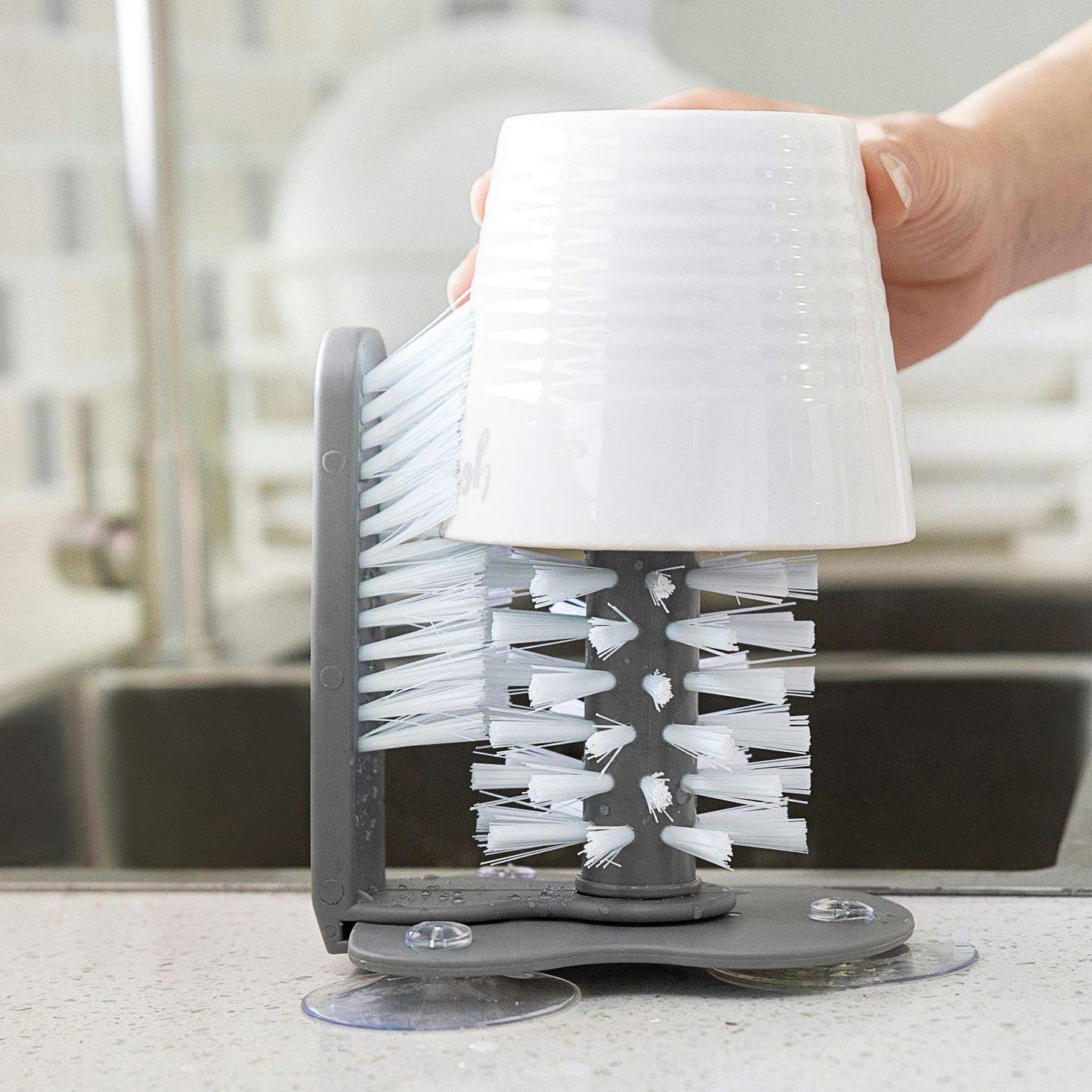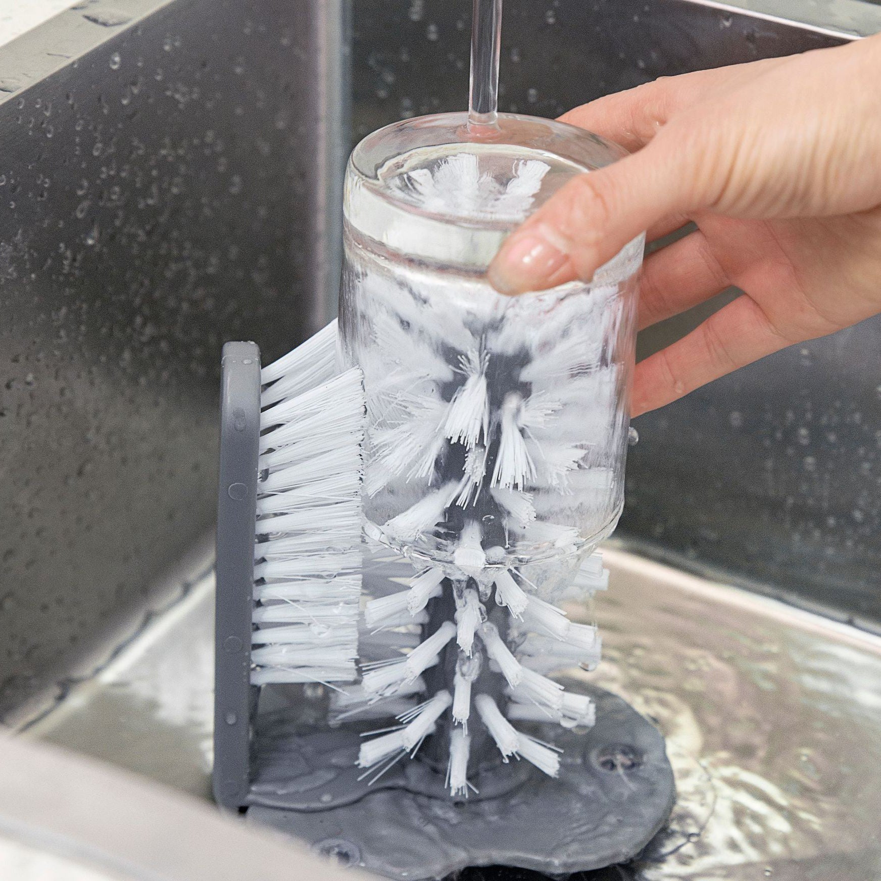 Sie bietet eine 360-Grad-Reinigungsleistung und bleibt dabei fest an ihrem Platz, wenn Sie das Glas zwischen den beiden Borstenpaaren drehen. Diese Bürste reinigt beide Seiten des Glases auf einmal und auch die schwer zugänglichen Stellen. Sie macht die Reinigung Ihrer Gläser zu einem Kinderspiel!