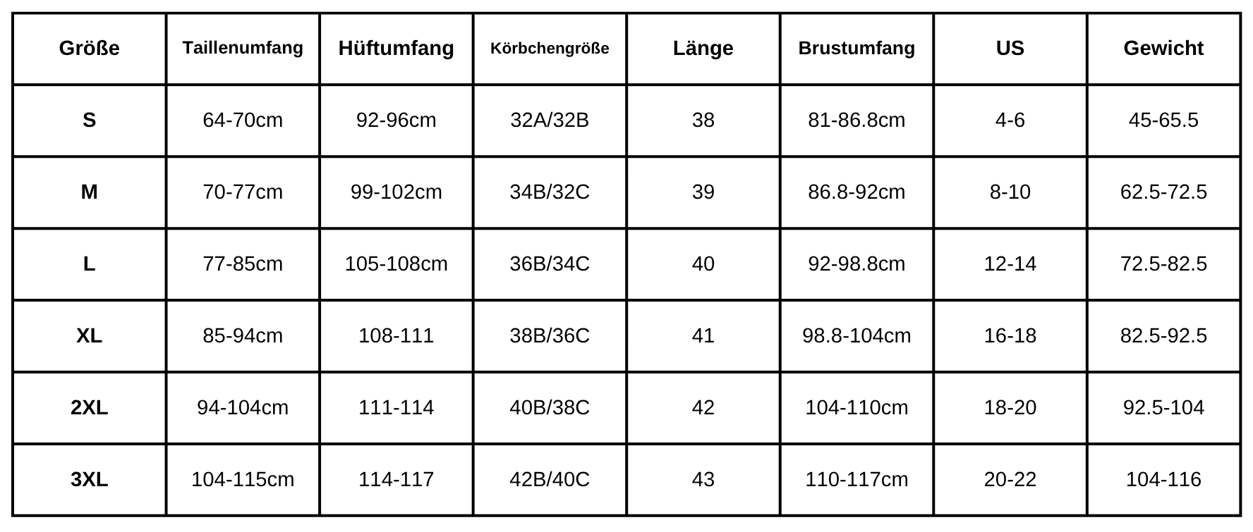 | Größe | Körperumfang | Hüfte | Gewicht |