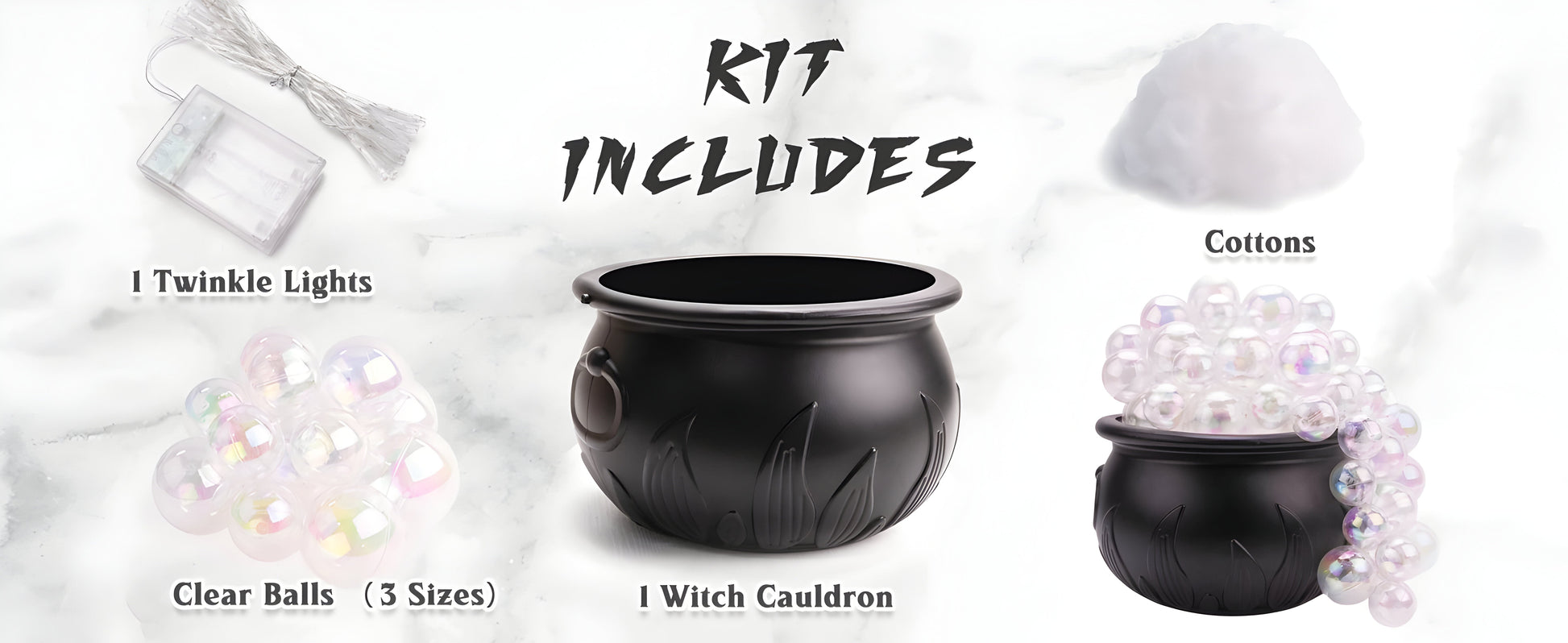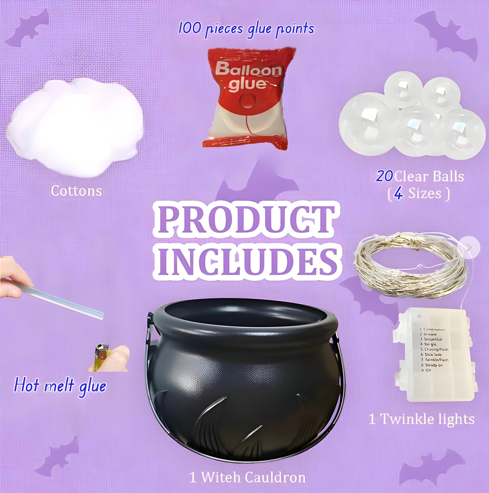 Im Lieferumfang enthalten – 1 Hexenkessel, 1 Fernbedienung, 40 g Baumwollfüllung, 20 transparente Kugeln und eine Lichterkette mit funkelnden Lichtern. Der Kessel misst 15 cm H x 10 cm D, die transparenten Dekorationskugeln sind in 3 verschiedenen Größen erhältlich.