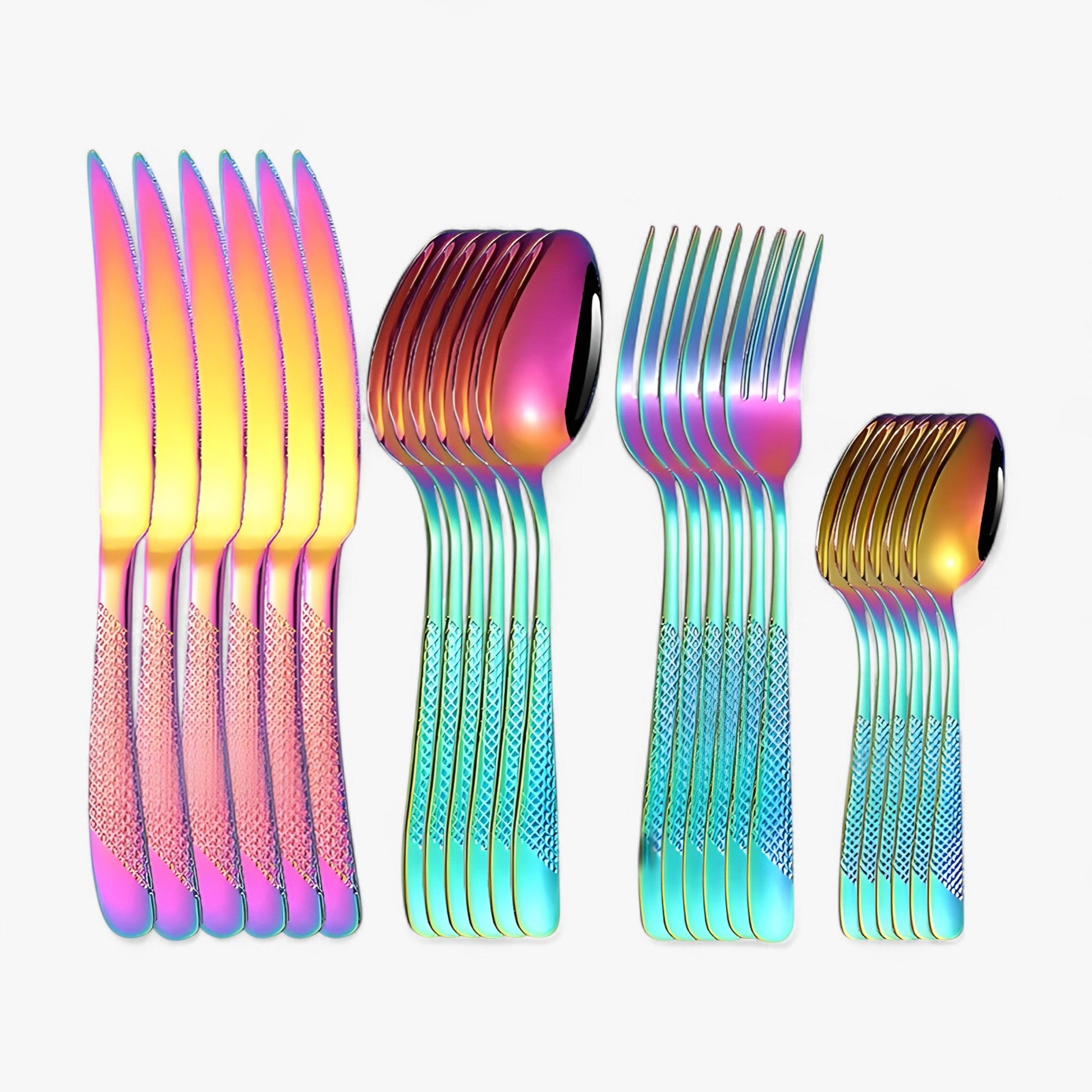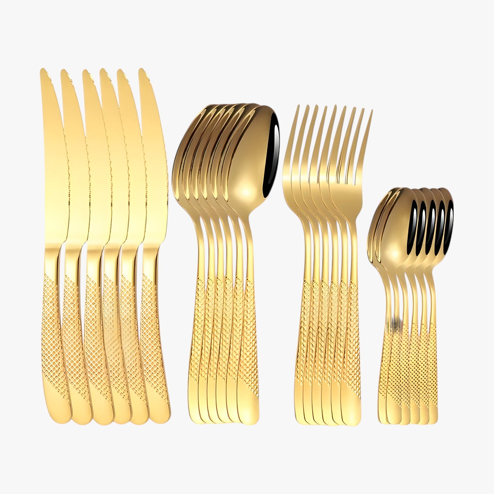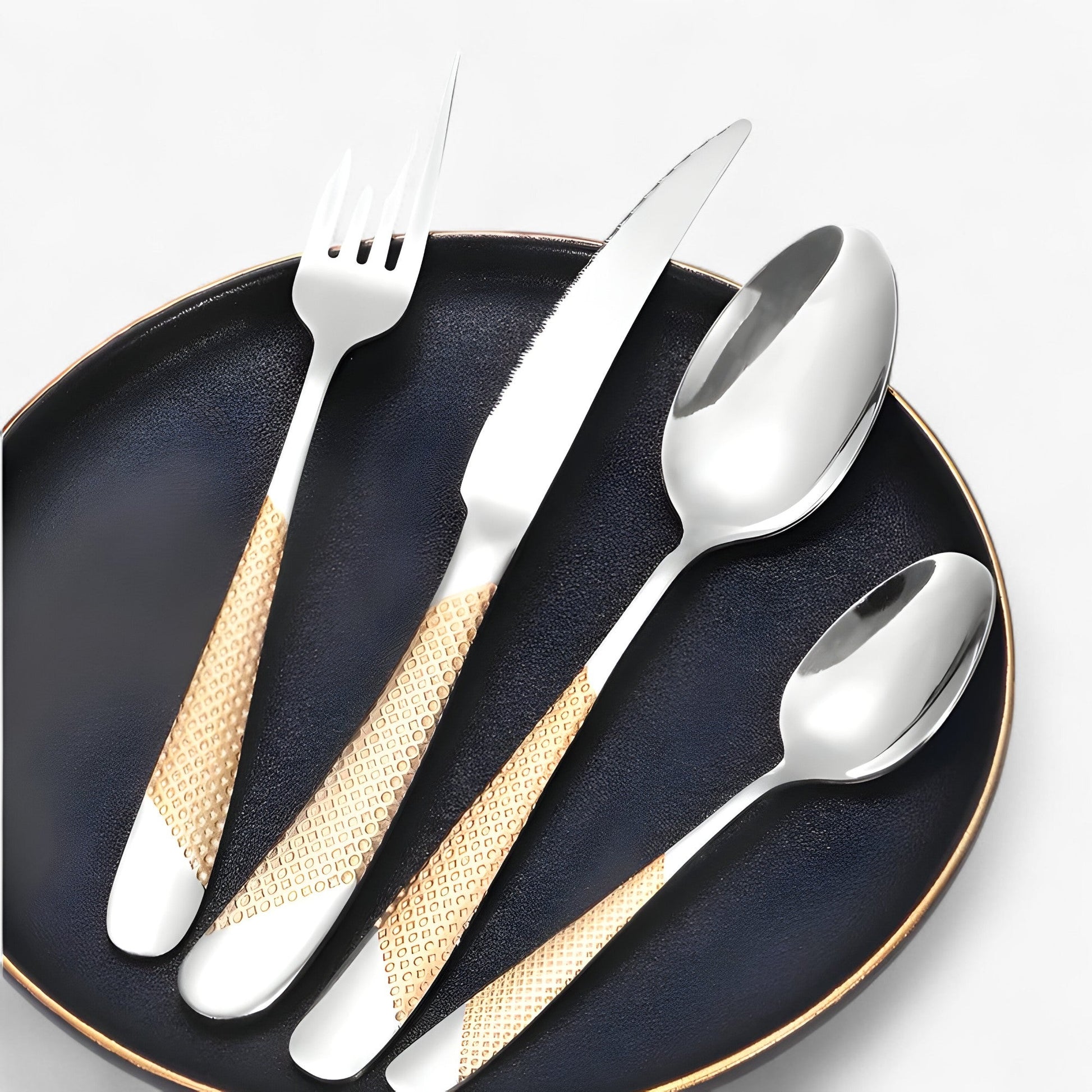 StarDine bestikssæt er din perfekte ledsager til enhver setting—fra hyggelige familiefester til ekstravagante bryllupper. Med sit genanvendelige og multifunktionelle design tilpasser dette sæt sig nemt til daglige måltider, festlige samlinger og udendørs eventyr.