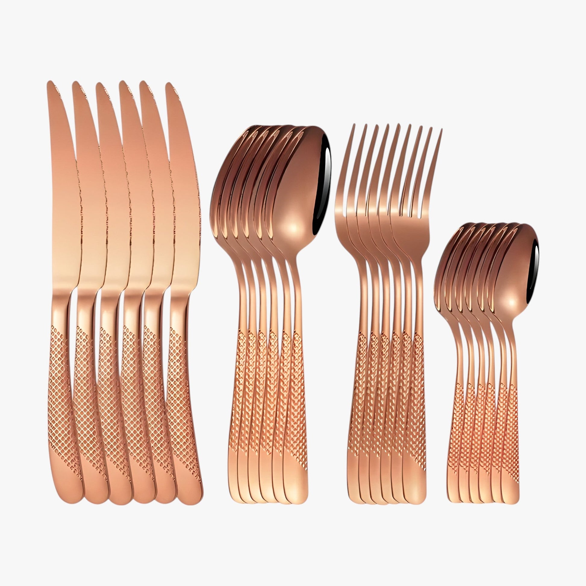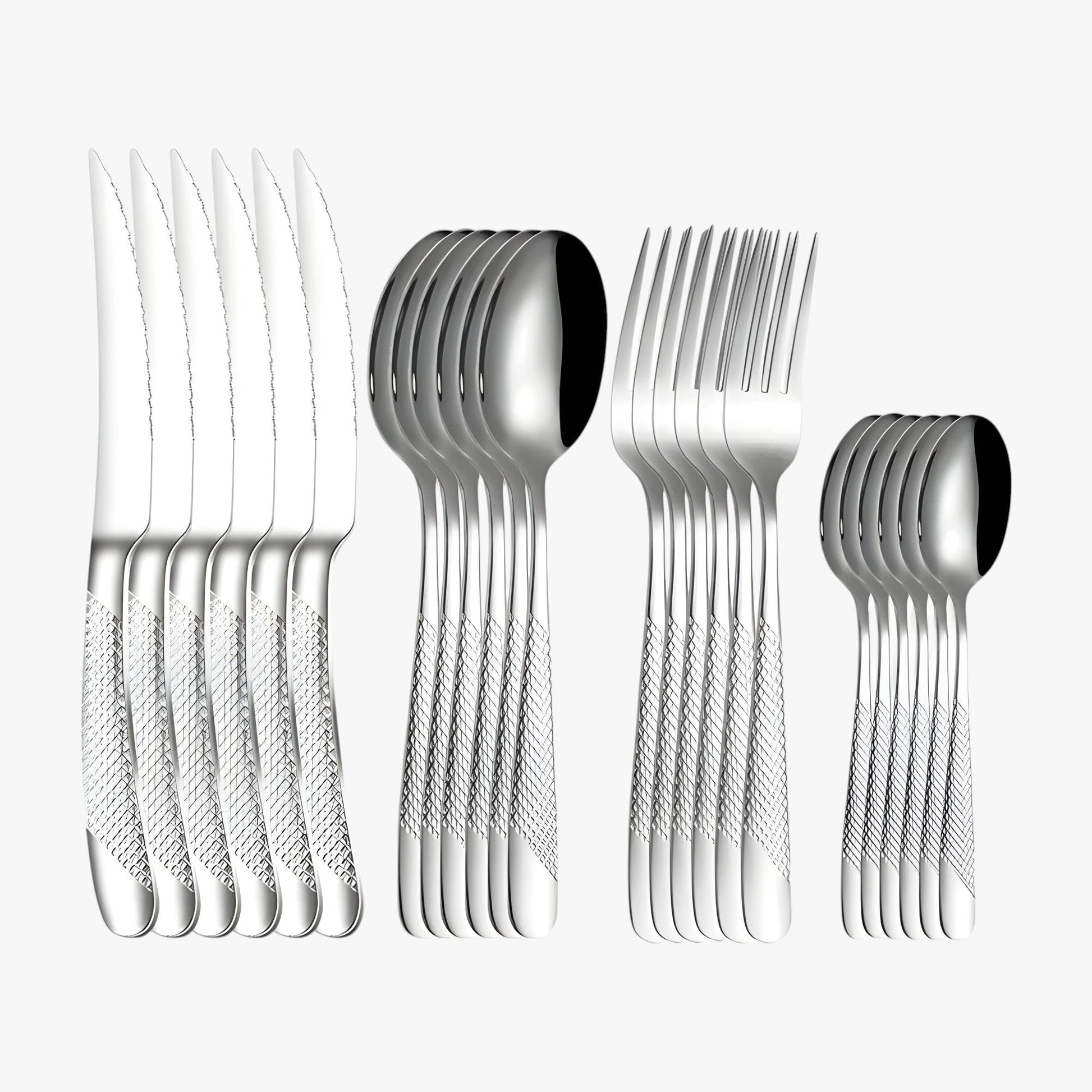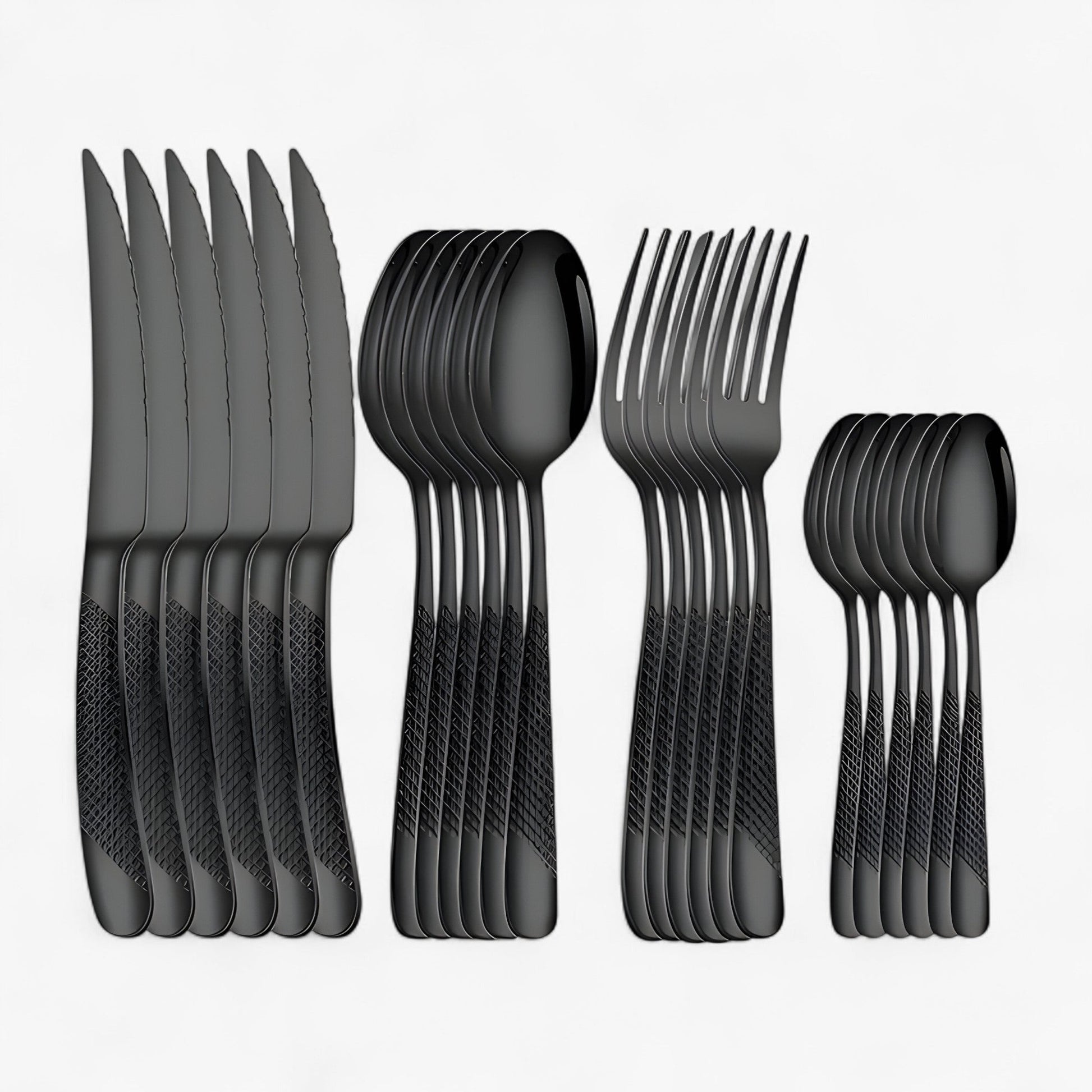StarDine bestikssæt er din perfekte ledsager til enhver setting—fra hyggelige familiefester til ekstravagante bryllupper. Med sit genanvendelige og multifunktionelle design tilpasser dette sæt sig nemt til daglige måltider, festlige samlinger og udendørs eventyr.