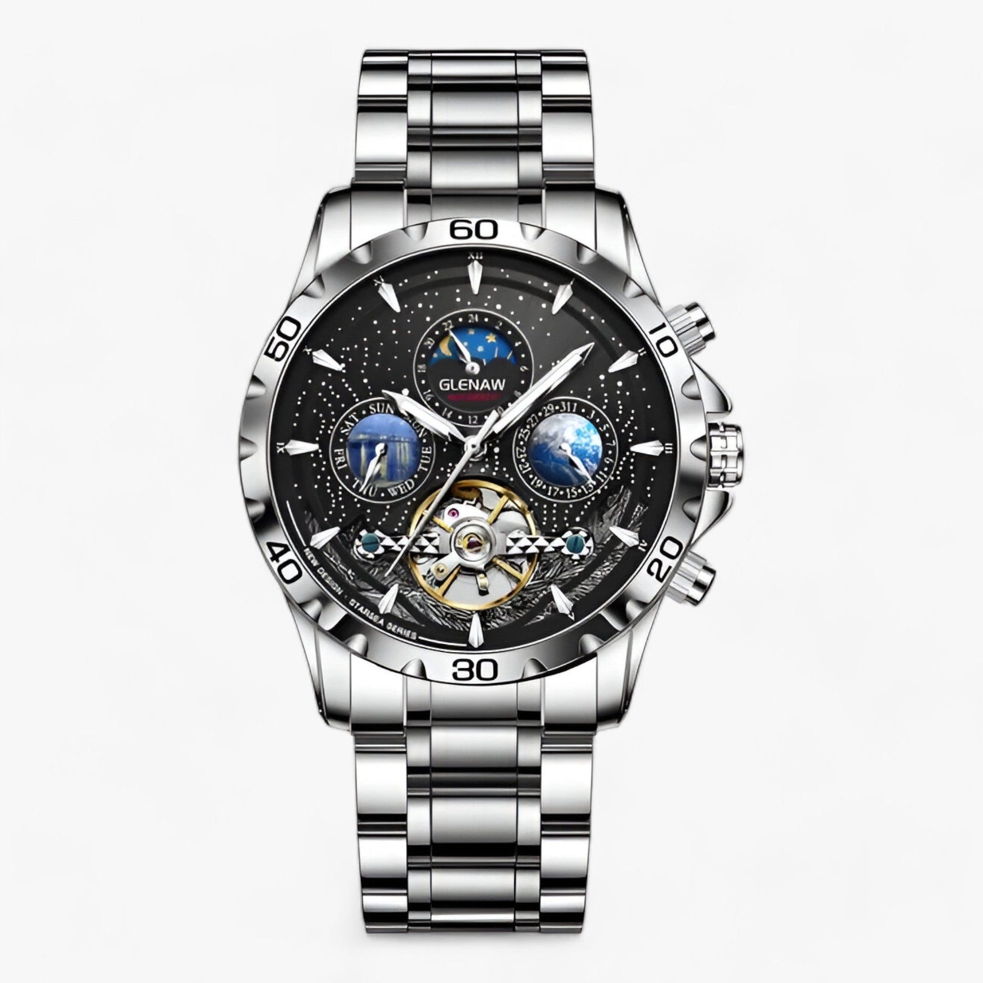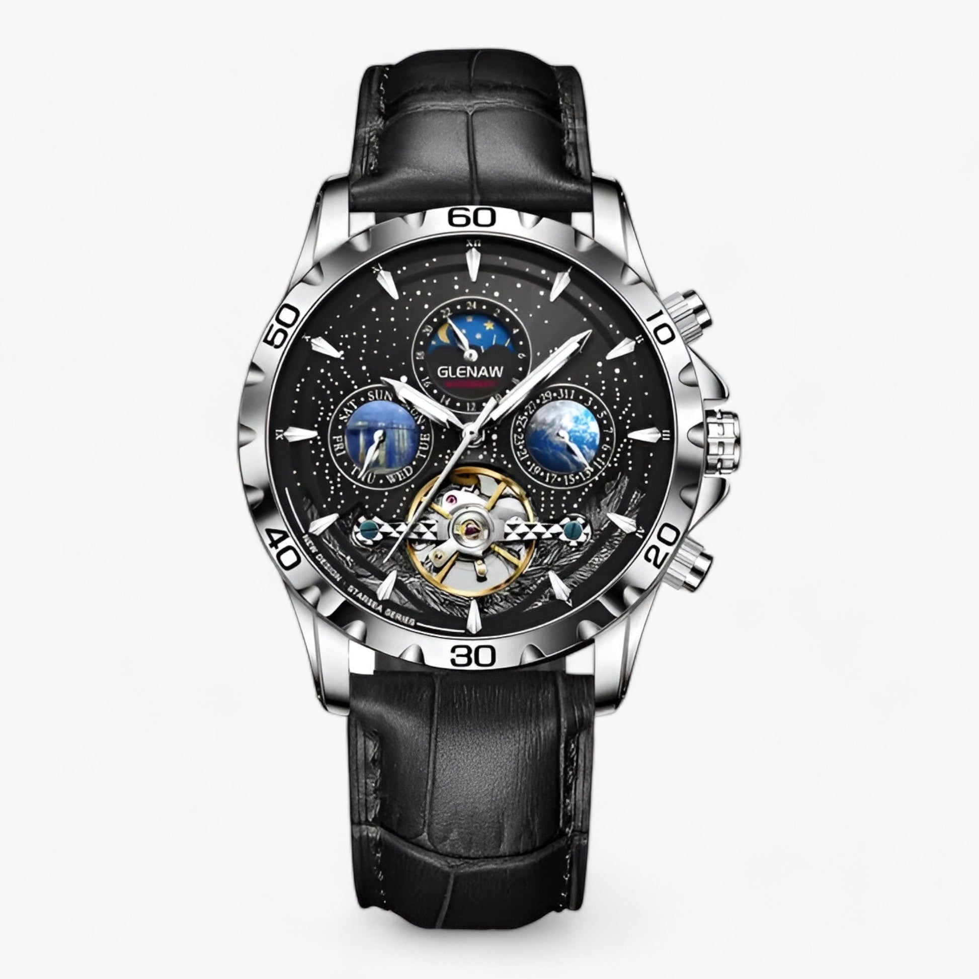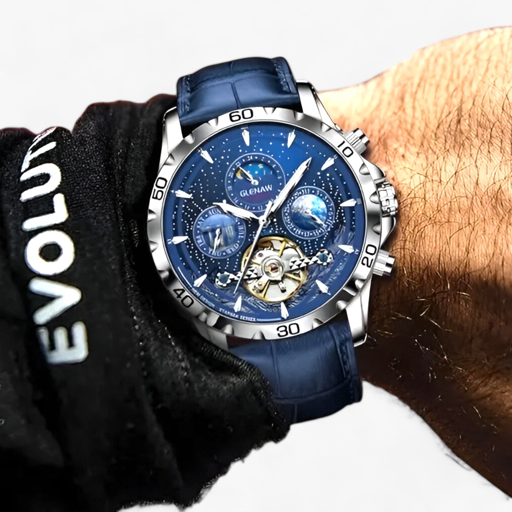 Die mechanische Uhr mit Sternenhimmel und Mondphasen für Männer vereint Eleganz und Funktionalität mit einem automatischen Uhrwerk und einem beeindruckenden Skelett-Tourbillon-Design. Diese wasserdichte Armbanduhr ist perfekt für professionelle und lässige Anlässe geeignet und bietet präzise Zeitmessung sowie eine anspruchsvolle Anzeige der Mondphasen.