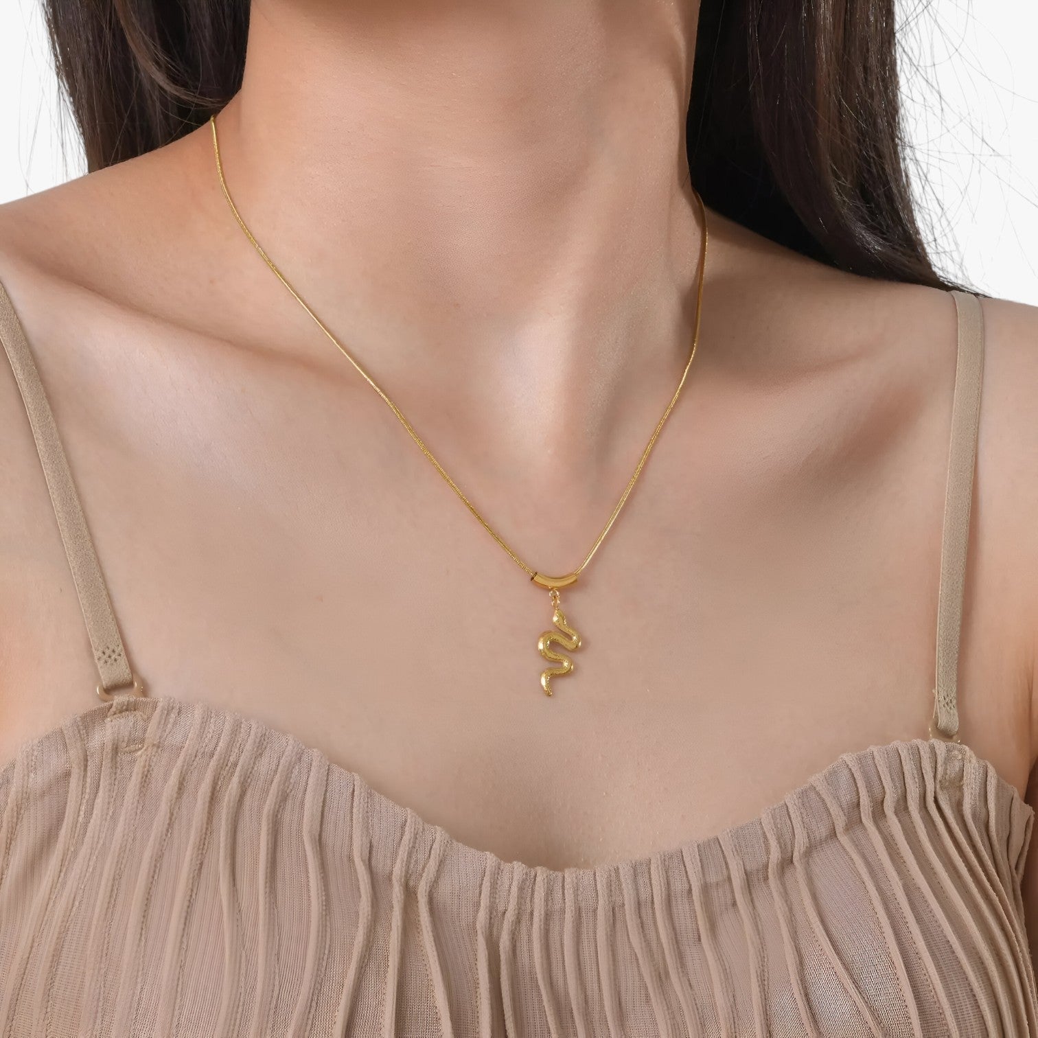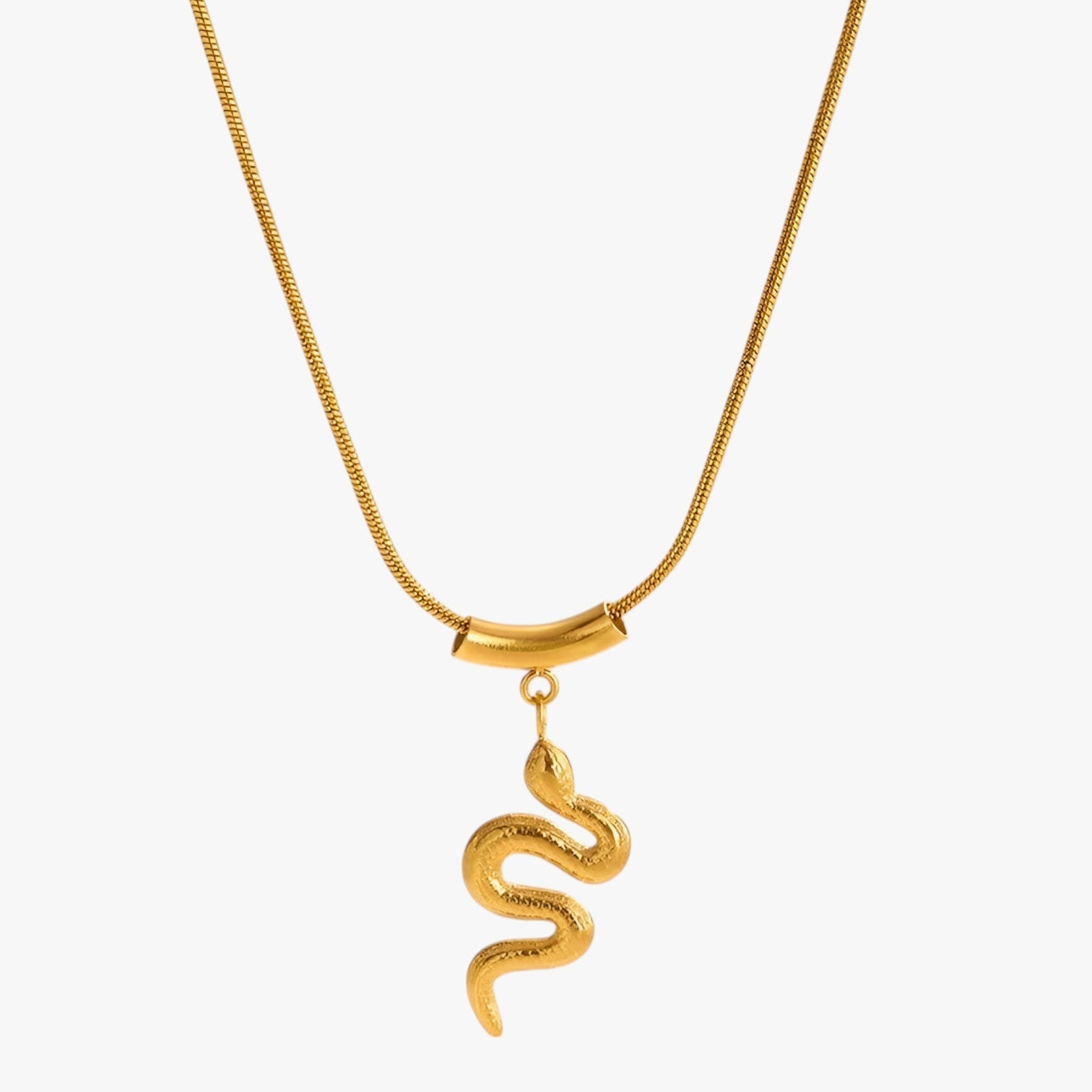 Diese goldene Schlangen-Halskette schmiegt sich elegant und geheimnisvoll um den Hals – perfekt für jede Gelegenheit.
